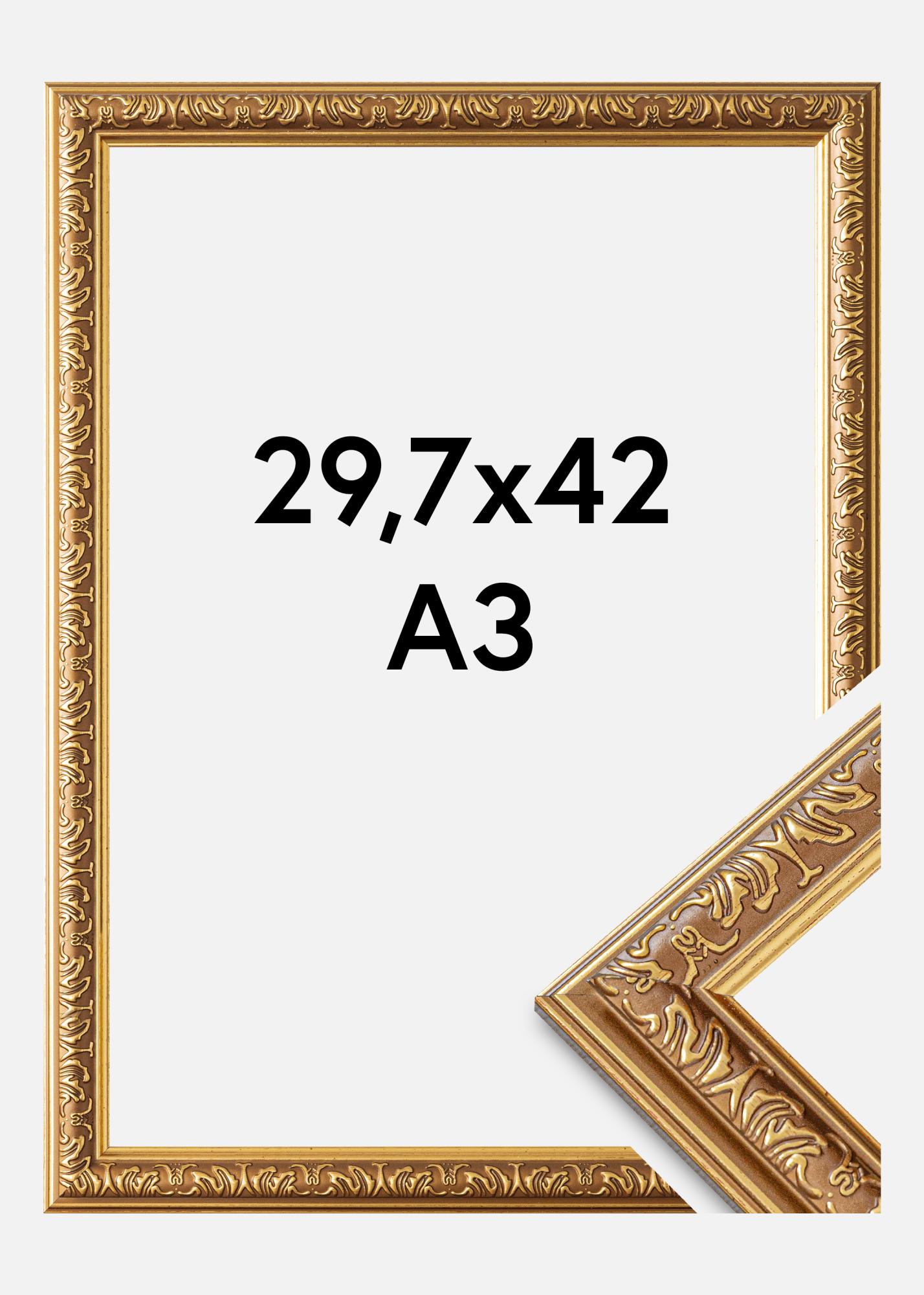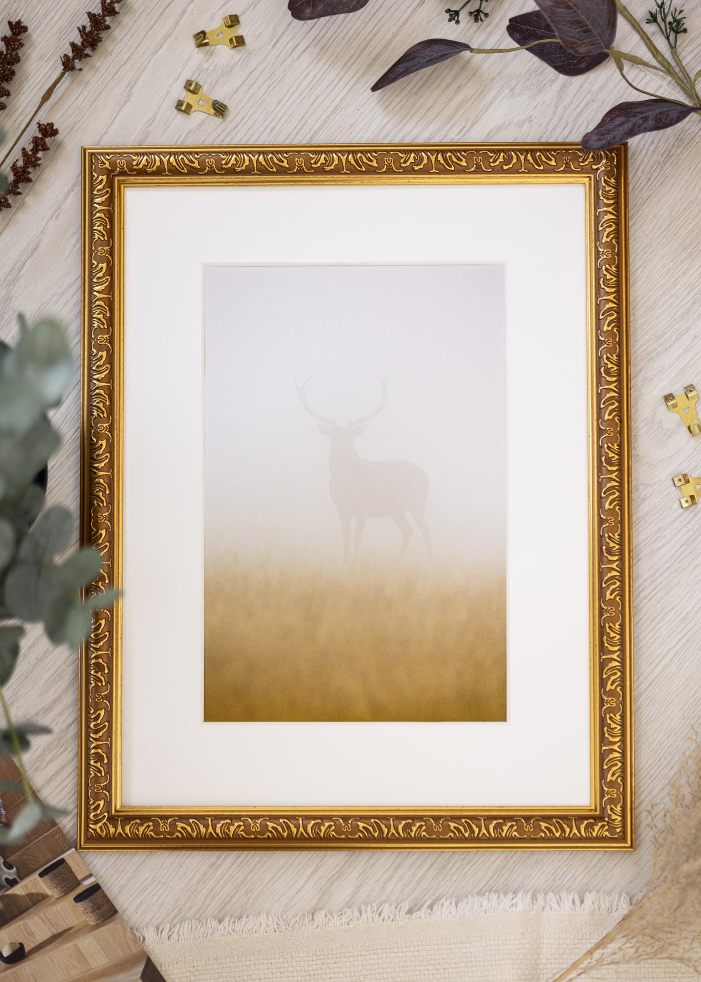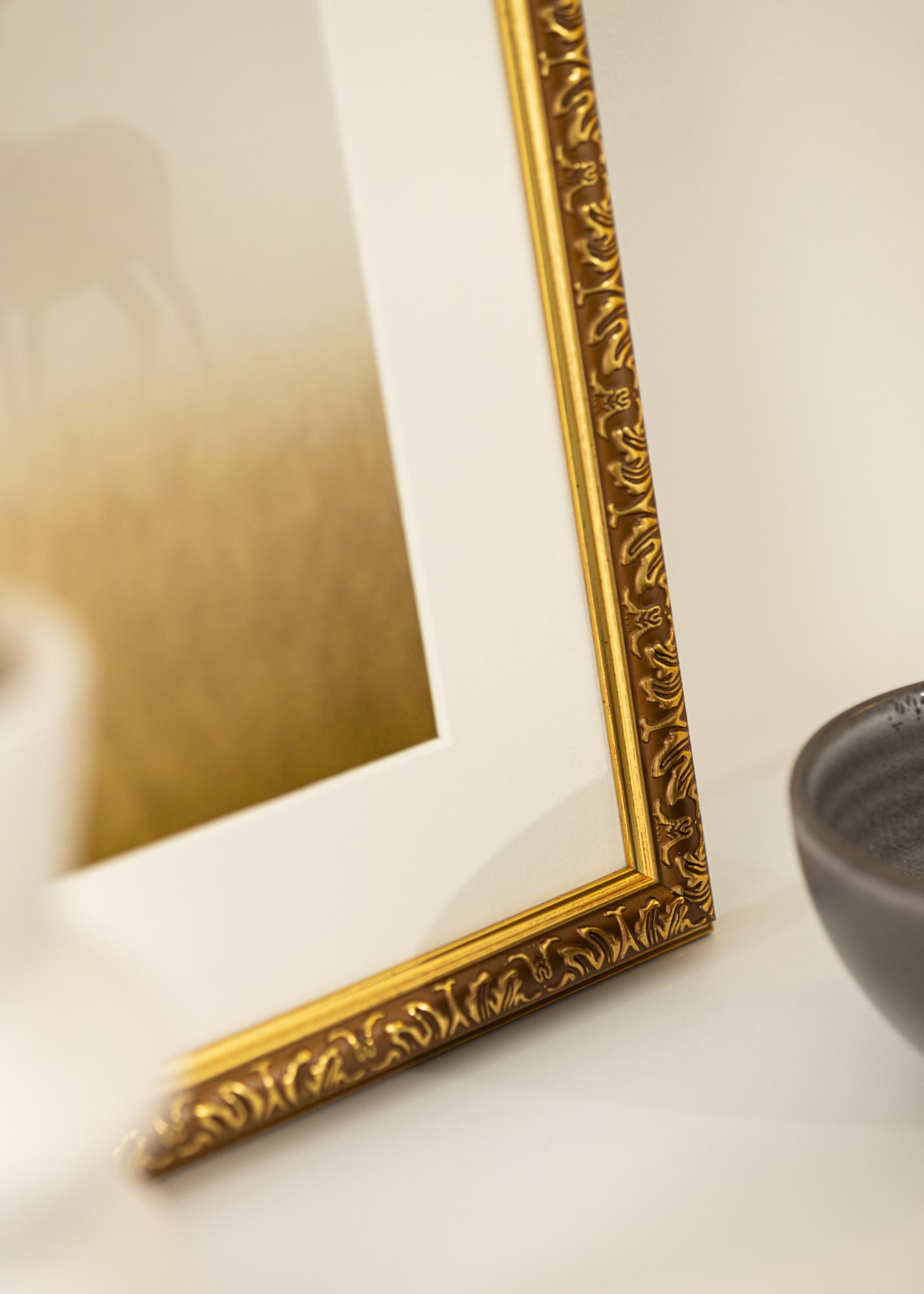 Zlatni okvir širine 28 mm ima dekorativne, ornamentirane detalje koji daju tradicionalan i bezvremenski osjećaj. Složeni uzorci duž unutarnjeg ruba pojačavaju sofisticirani izgled, čineći ga idealnim za klasične i elegantne stilove uređenja interijera. S dubinom od 20 mm, okvir pruža stabilno i čvrsto uokvirivanje vaših slika.