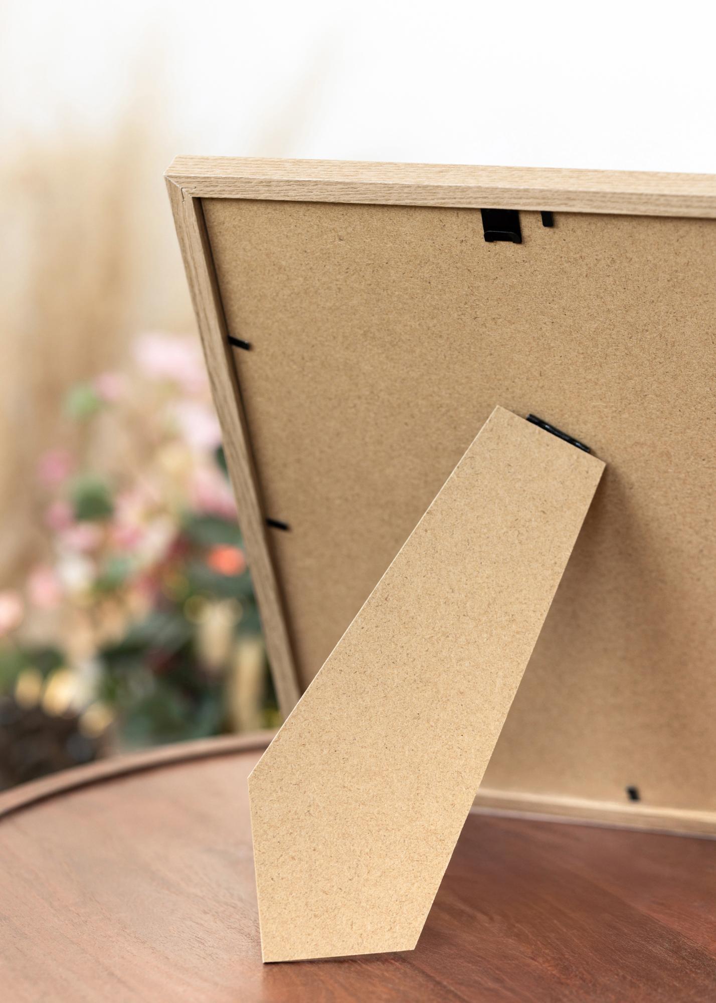Ovaj okvir za slike izrađen je od MDF materijala i ima elegantnu površinu boje hrasta te pravo staklo. Tanka letvica okvira od samo 14 mm ostavlja elegantan dojam. Stražnja ploča se drži na mjestu pomoću savitljivih čavlića, i lako se odvaja kada želite postaviti svoje slike.