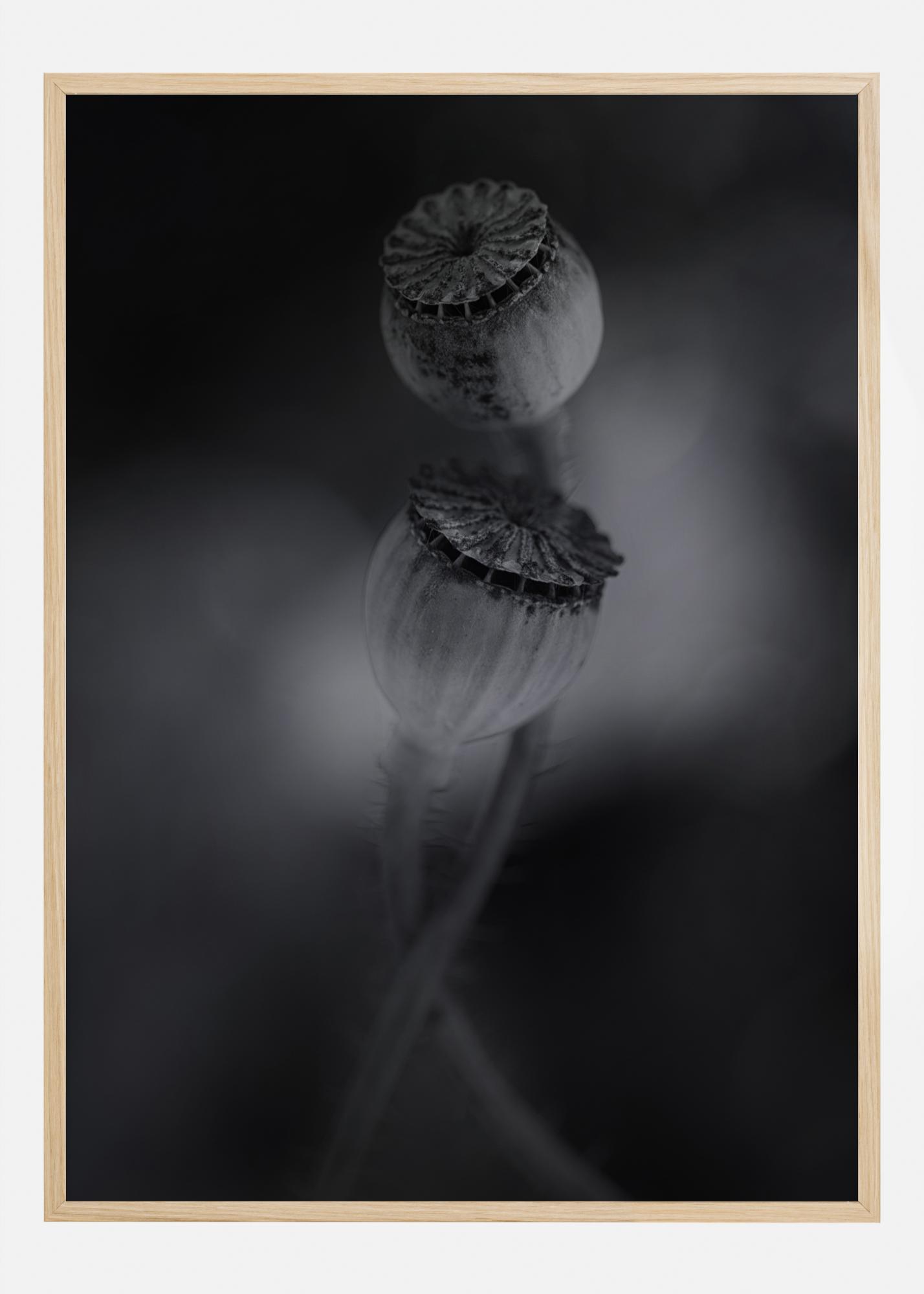 Nevjerojatan crno-bijeli plakat izbliza s dvije precvjetale makove. Dvije kapsule sjemena isprepletene su dok prirodna svjetlost stvara mutnu crnu pozadinu. U isto vrijeme, svjetlost naglašava ljepotu biljaka. Dodajte dodir mira u svoj dom s ovim ispisom.