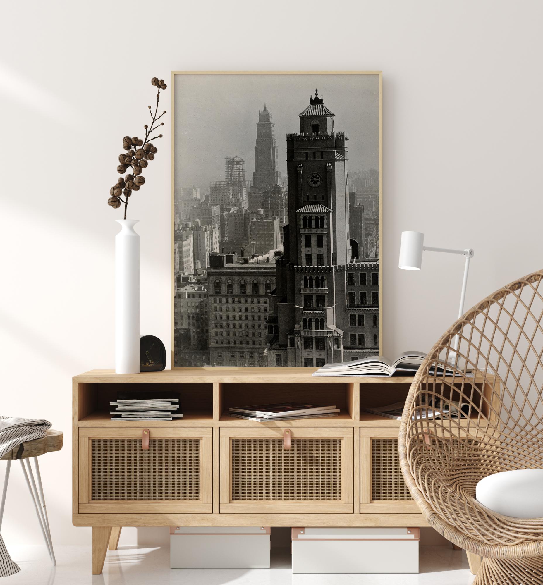 Crno-bijeli tisak sa starim gradom. Sivi obris grada savršeno se stapa s istim sivim zgradama. Grad se sastoji od zgrada različitih visina. U prvom planu prirodno svjetlo sja izravno na istočnu stranu glavne zgrade. Objesite ovaj poster u svoju radnu sobu i promatrajte stari grad.