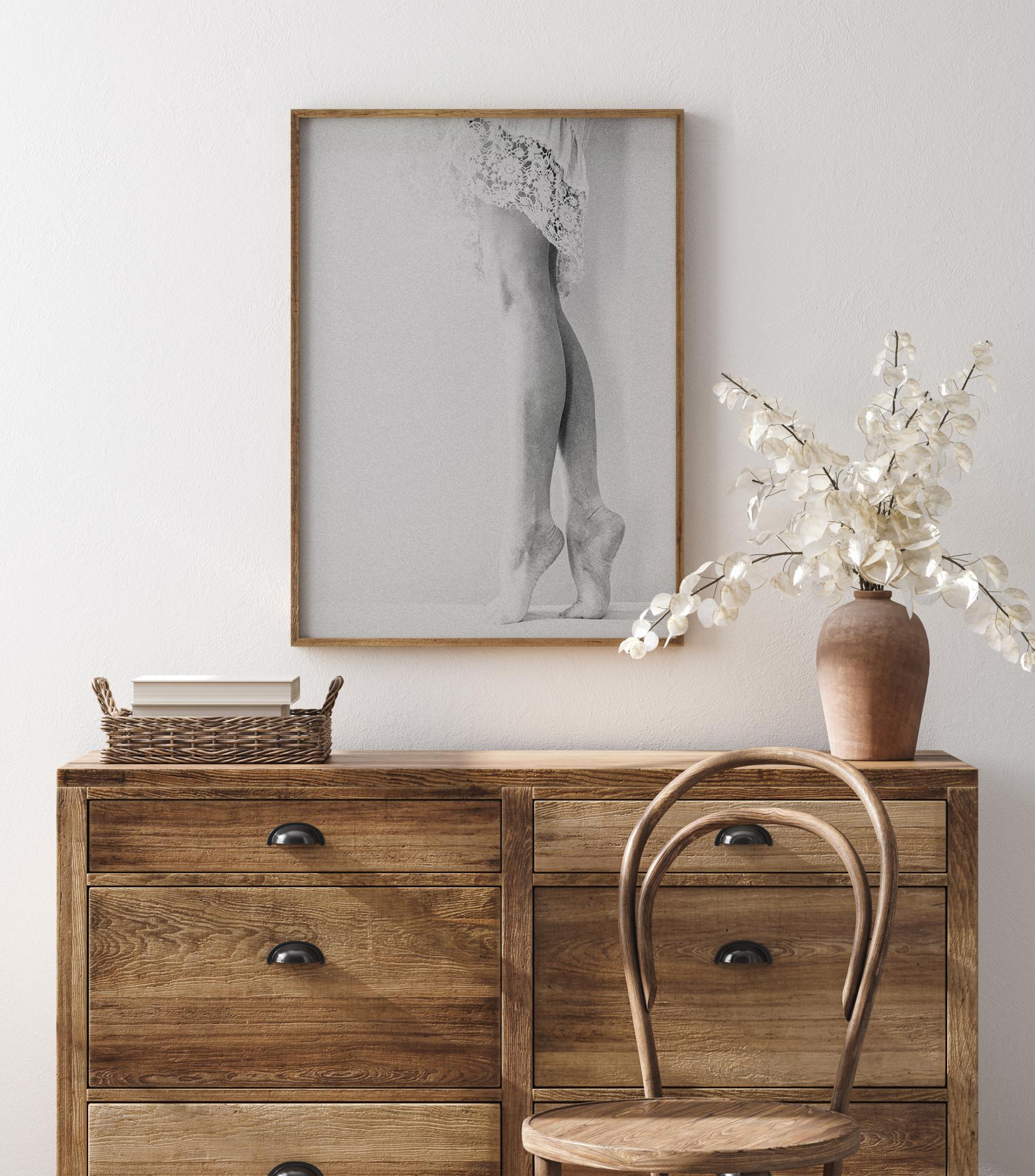 Elegantni poluportret žene koja stoji na prstima. Jednostavnost slike u kombinaciji sa suptilnom bijelom čini ovu sliku izvrsnim dodatkom za vašu spavaću sobu ili dnevni boravak.