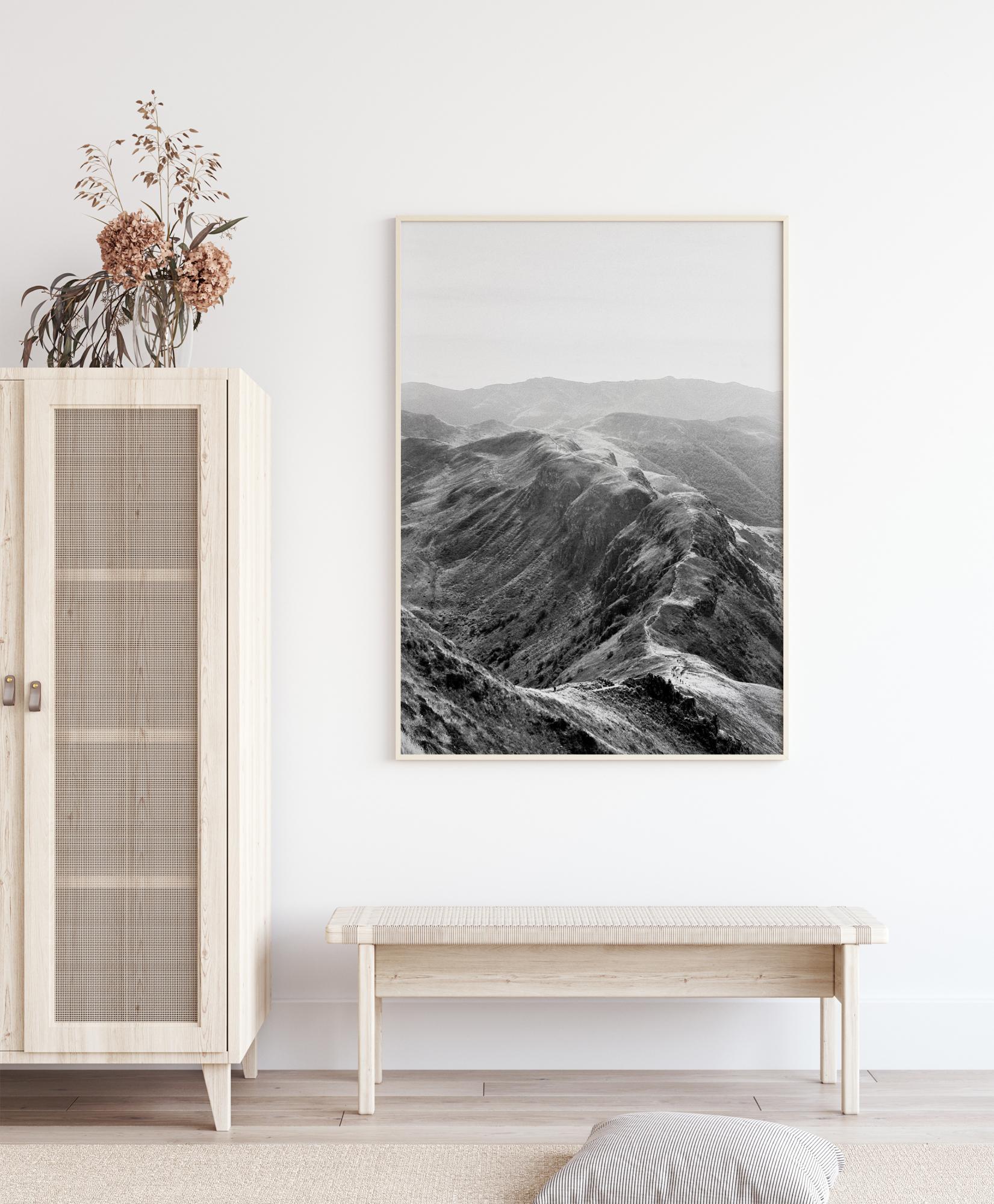 Crno-bijeli poster s planinskim lancem. Različite nijanse sive savršeno se stapaju jedna u drugu. Bez znakova vegetacije ili života, gotovo možete čuti tišinu na vrhovima planina. Objesite ovaj otisak na šareni zid i slušajte vjetar koji puše.