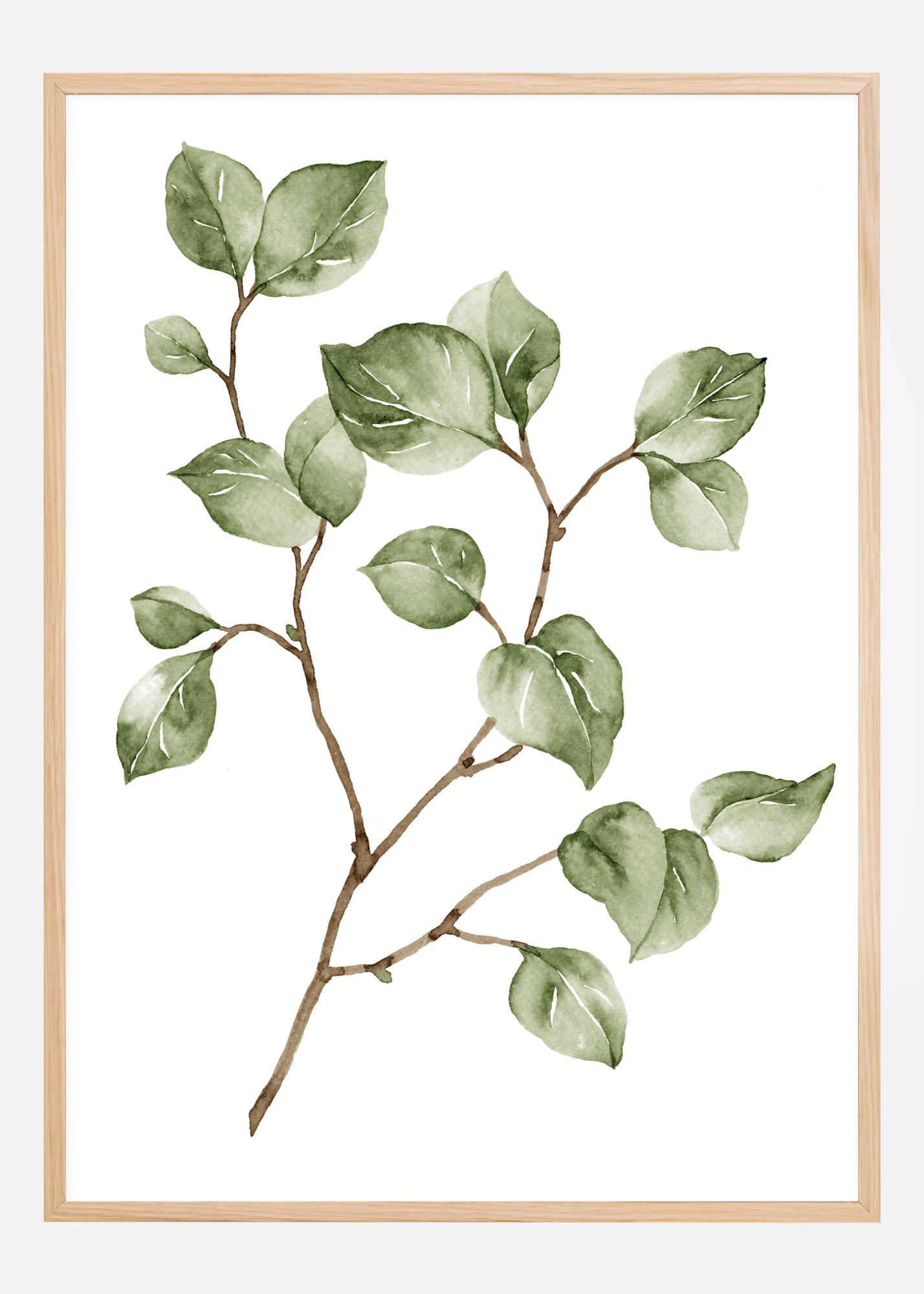 Prekrasan poster s tankom smeđom granom s malim zelenim listovima. Naslikan na bijeloj površini, meke smeđe i zelene boje ističu delikatne bijele žile na listovima. Prekrasan ispis za objesiti na svijetlozeleni zid.