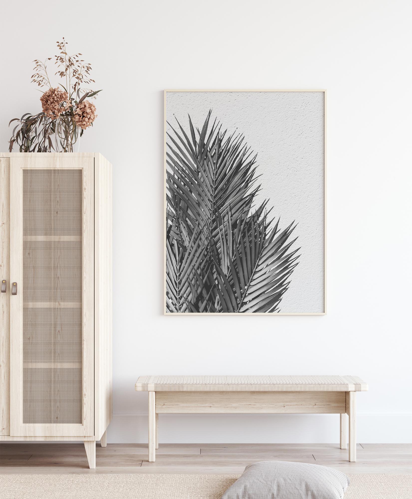 Crno-bijeli poster s palminim lišćem koje se naginje prema grubom bijelom zidu. Grubi zid naglašava palmina lišća koja leže jedno na drugome. Kada stojite lijevo od slike, gotovo možete osjetiti kako toplina dopire do lišća. Objesite ovaj tisak u svojoj ljetnoj kući za tropsku atmosferu.