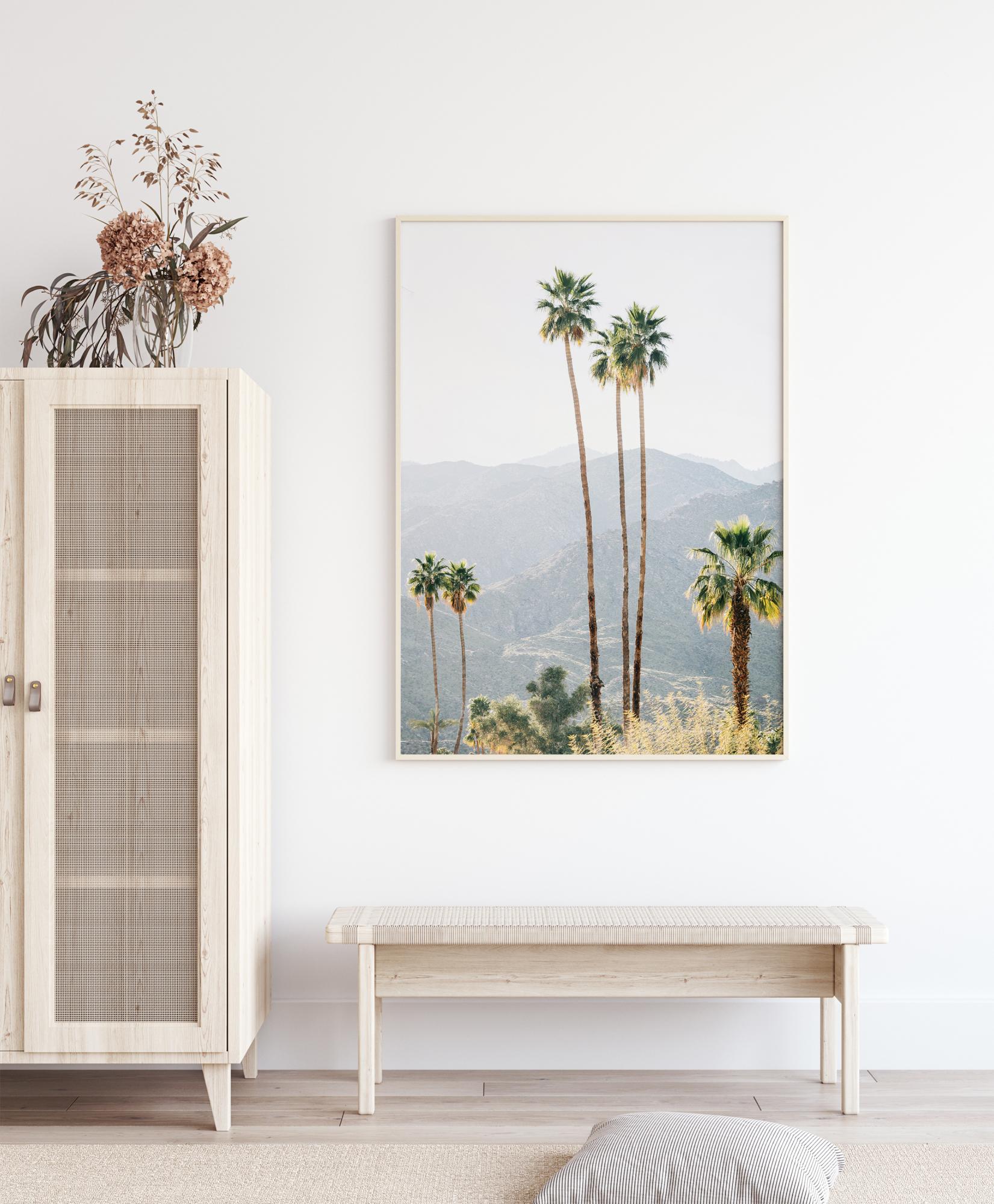 Panoramski poster s brežuljkastim krajolikom sunčanog poslijepodneva. Oblacima pokriveno nebo savršeno se stapa s udaljenim brežuljcima, dok palme visoko stoje u prvom planu. Sunce snažno svijetli na palme, dajući dodatnu toplinu otisku. Savršena slika za svaku sobu u vašem domu.
