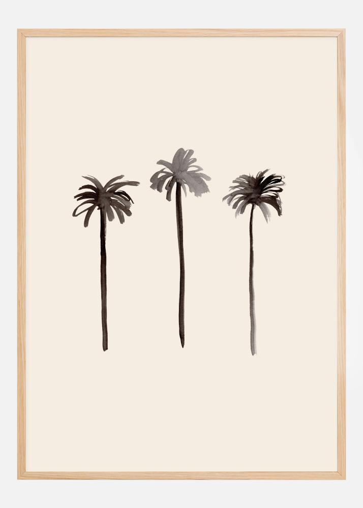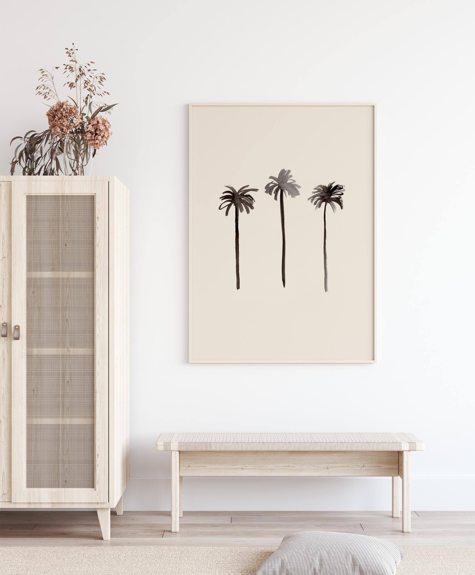 Jednostavan crno-bijeli ručni otisak s tri palme u nizu. Na bež pozadini korištene su različite nijanse crne kako bi se stvorila tamna boja na listovima. Jednostavan poster koji se uklapa za vješanje na zid dnevne sobe.