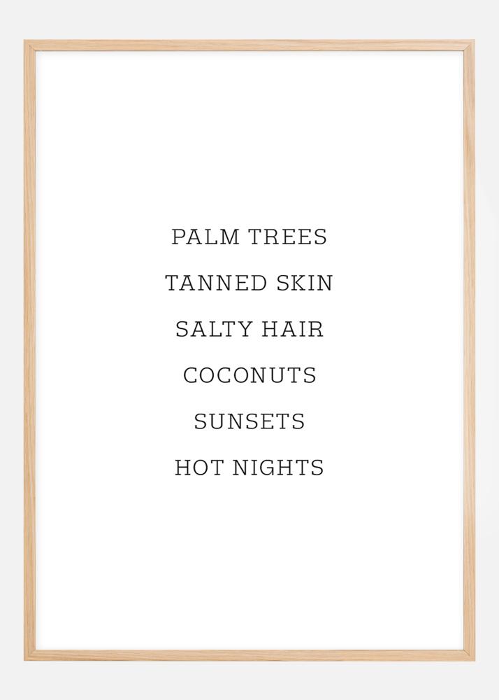 Pasivni poster koji prenosi poruku s ljetnim osjećajem. S crnim fontom na bijeloj površini stoje riječi: PALME, PREPLANULA KOŽA, SLANA KOSA, KOKOSI, ZALASCI SUNCA, TOPLE NOĆI. Centrano smještene riječi podsjećaju nas na ljetnu sezonu. Dodajte dašak ljeta u svoj moderni dnevni boravak uz pomoć ovog otiska.