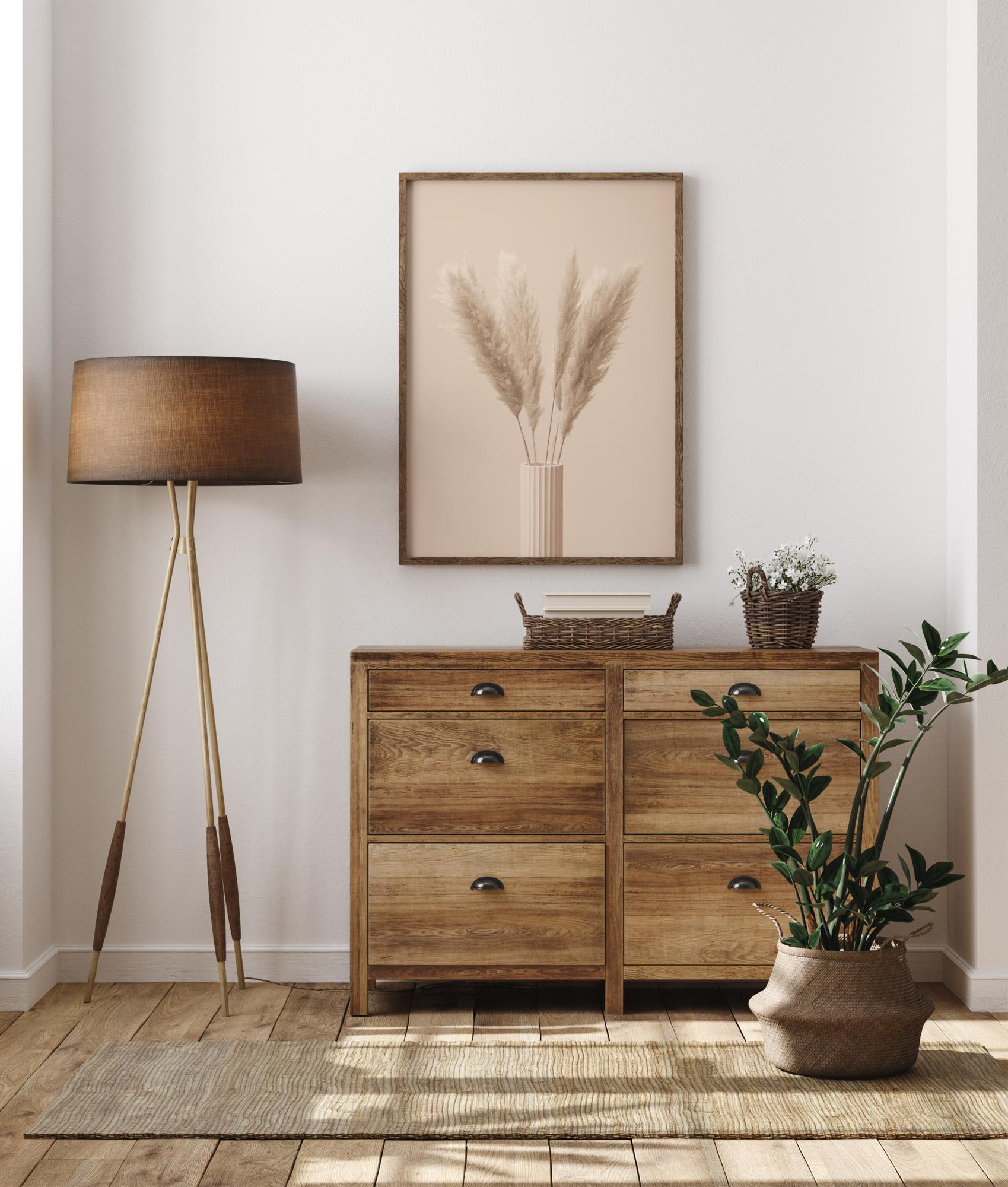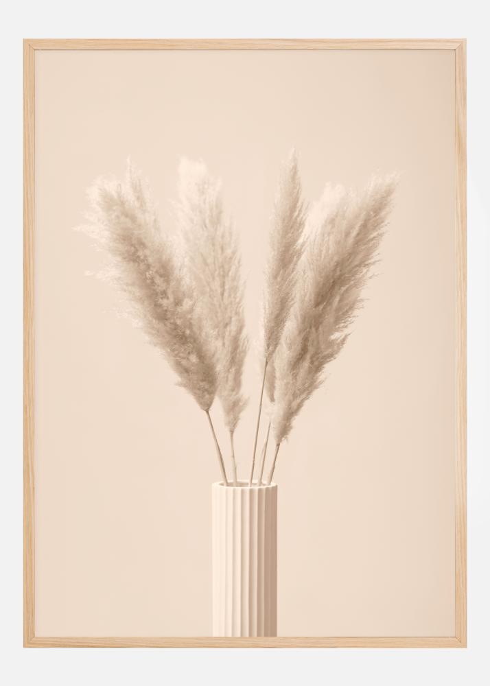 Plakat s cvijećem s pampas travom u vazi. Cvjetne glavice ističu se na ružičastoj sepi pozadini, što daje osjećaj mekoće, dok je vaza čvrsta. Ova slika unosi dašak elegancije u dom.