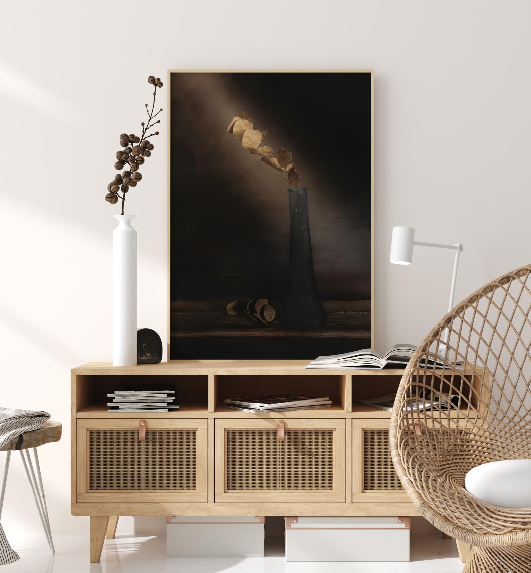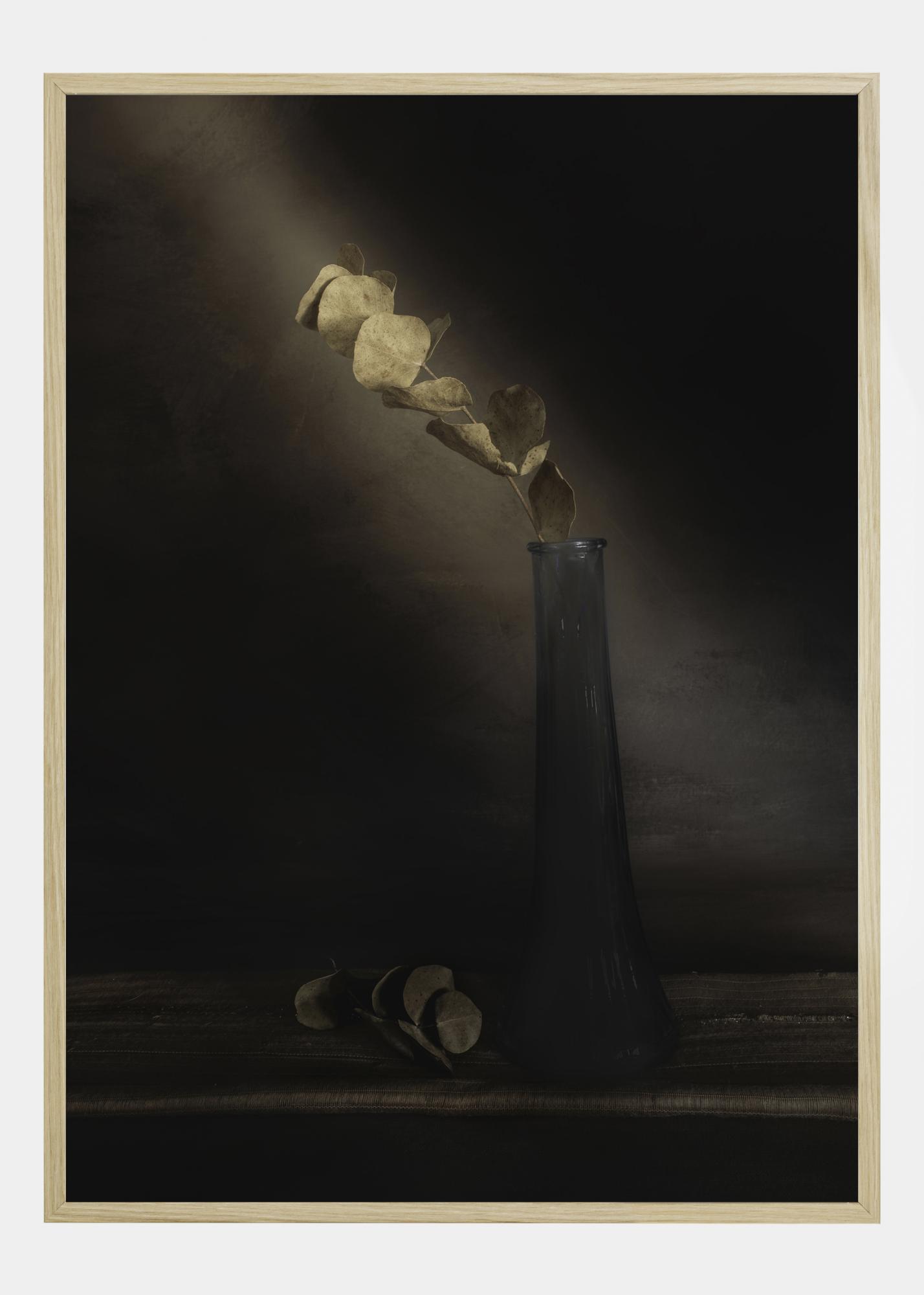 Jednostavan, ali lijep otisak jednostavne stabljike sa suhim listovima u staklenoj vazi. Na svijetlosmeđoj pozadini prirodna svjetlost izravno obasjava sušenu travu. Na dnu slike nalazi se skup listova koji su otpali sa stabljike. Prekrasan poster za objesiti u mirnom okruženju.