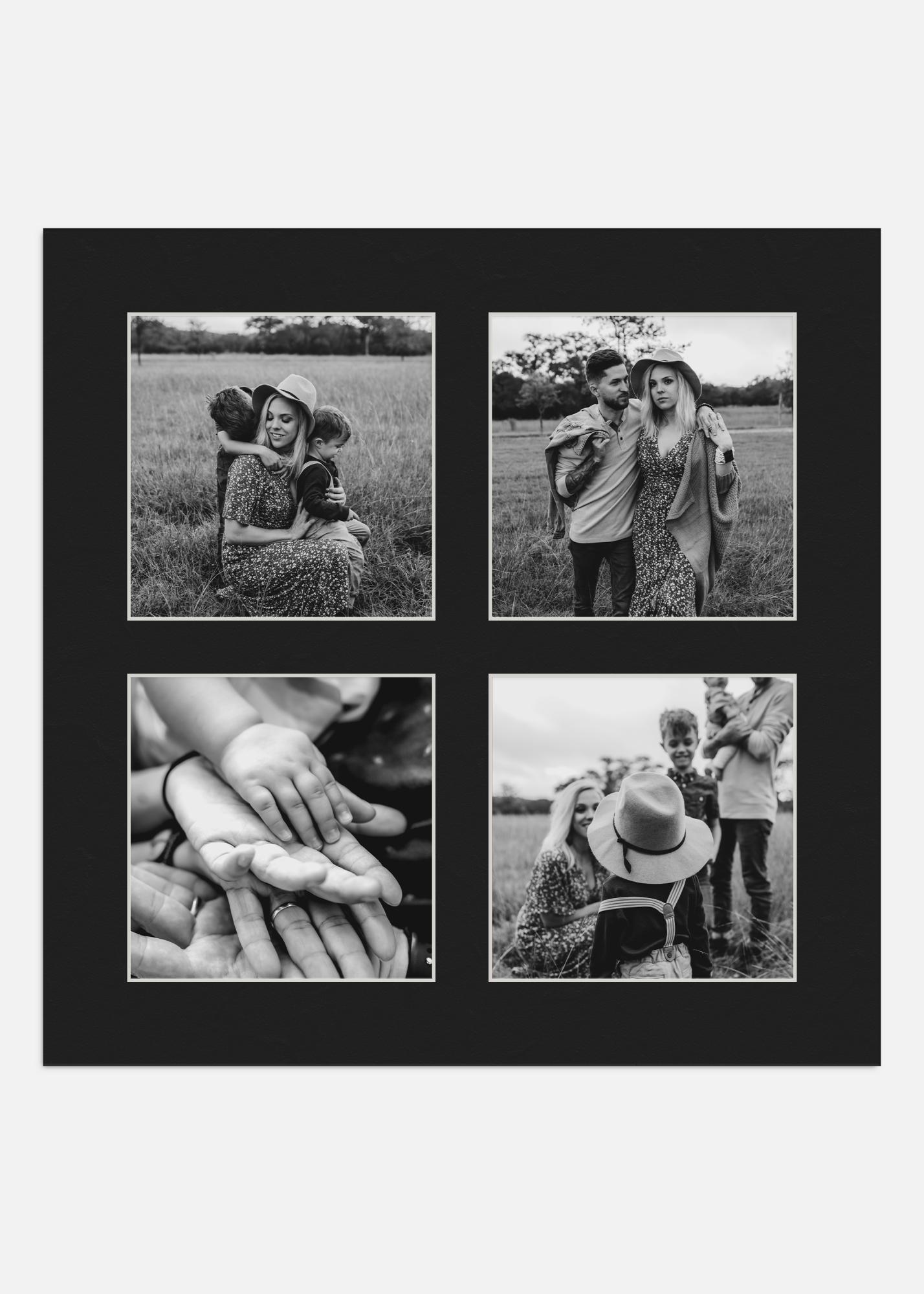 Beskiselni crni kolažni passepartout sa kosim bijelim rubovima najviše kvalitete. U passepartoutu ima mjesta za 4 slike. Savršeno kada želite napraviti vlastiti osobni fotokolaž.