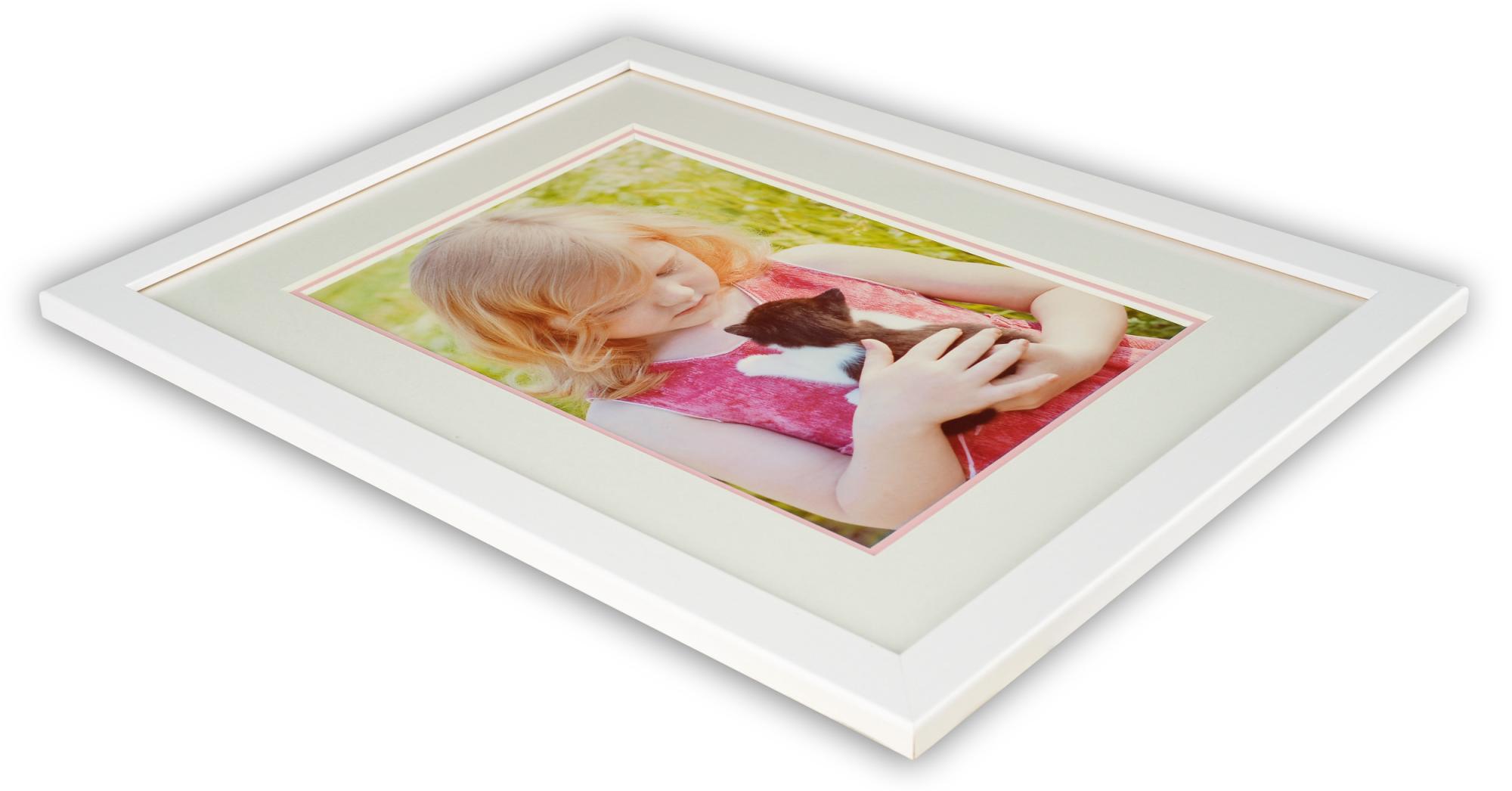 Prilagođeni paspartu u dva sloja s bijelim paspartuom kao bazom i donjim slojem u svijetloružičastoj boji koji daje obojeni rub od 5 mm oko slike. Savršeno kada želite napraviti efektno uokvirivanje koje ističe vašu sliku i daje dodatnu dubinu motivu. Svi naši paspartui imaju lijepo izrezane rubove pod kutom od 45 stupnjeva što daje ozbiljno i profesionalno uokvirivanje vašim slikama.