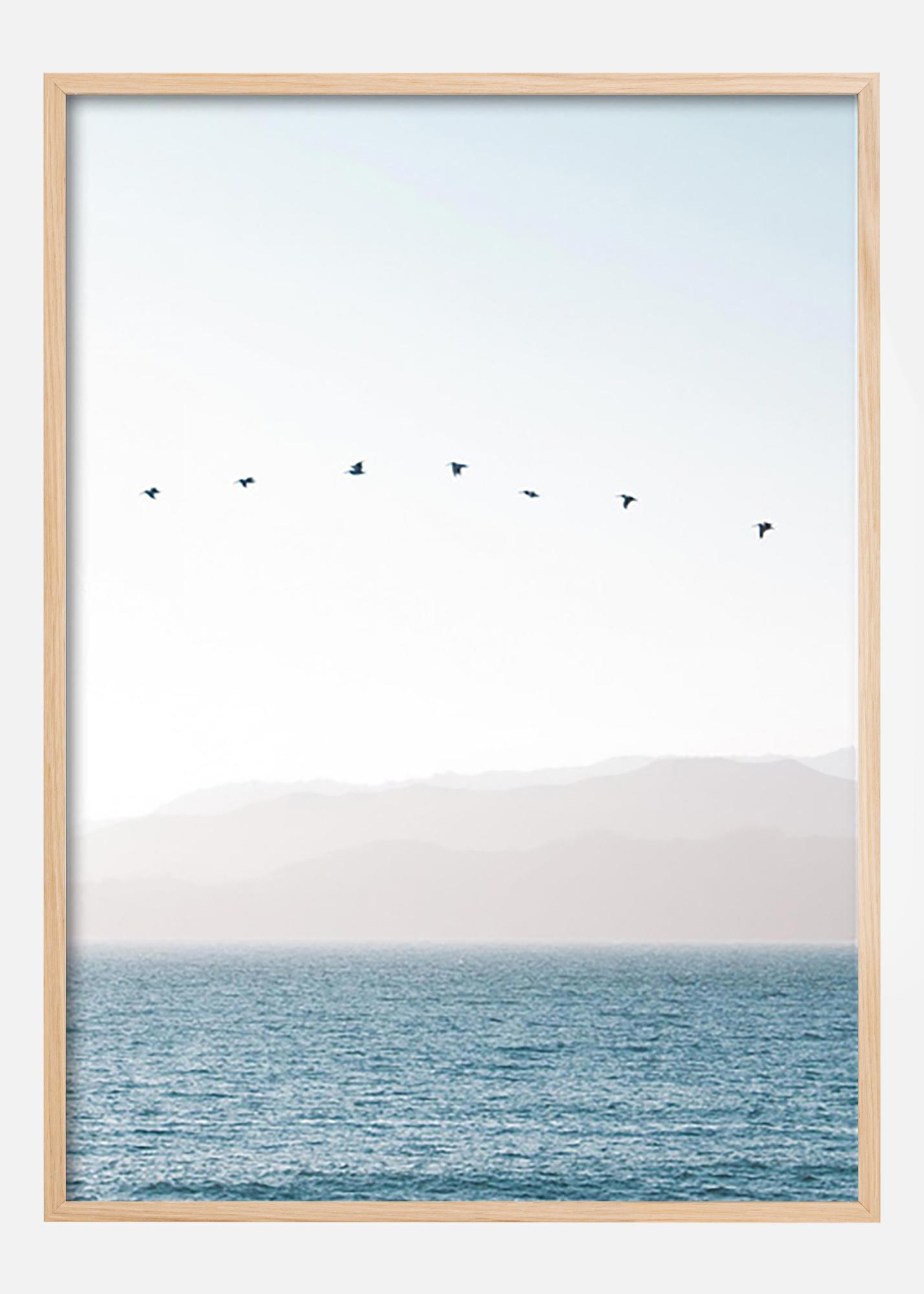 Prekrasna prirodna fotografija ptica koje lebde iznad plave vode prema pozadini planina prekrivenih maglom i bijelog neba. Miran i harmoničan poster u osvježavajućim tonovima koji jednako dobro pristaje u kupaonici kao i u spavaćoj sobi ili dnevnom boravku.