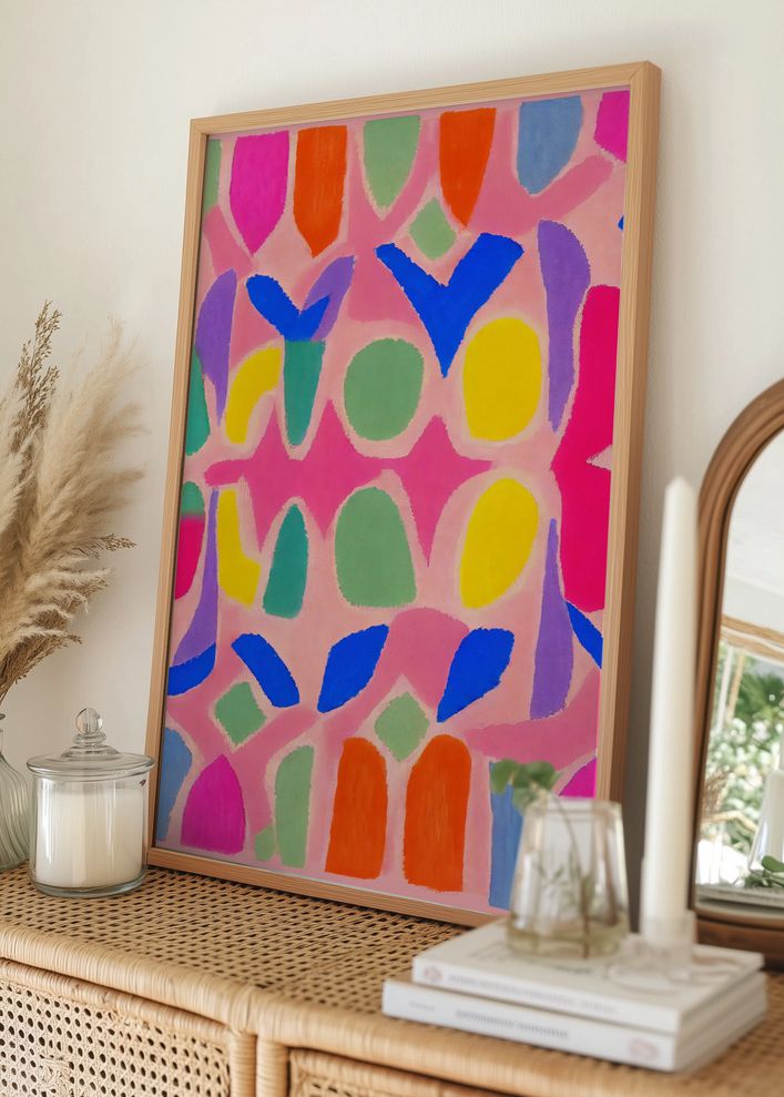 Ovaj živopisni poster donosi eksploziju boja i kreativnih oblika koji privlače pogled i stvaraju jedinstven dojam. Motiv odlikuje skladna mješavina Roza, Plava, Žuta, Zelena i Ljubičasta, što prostoru daje energičnu i veselu atmosferu. Apstraktne figure na ovom printu savršene su za dodavanje živopisnog i modernog dojma svakom prostoru.