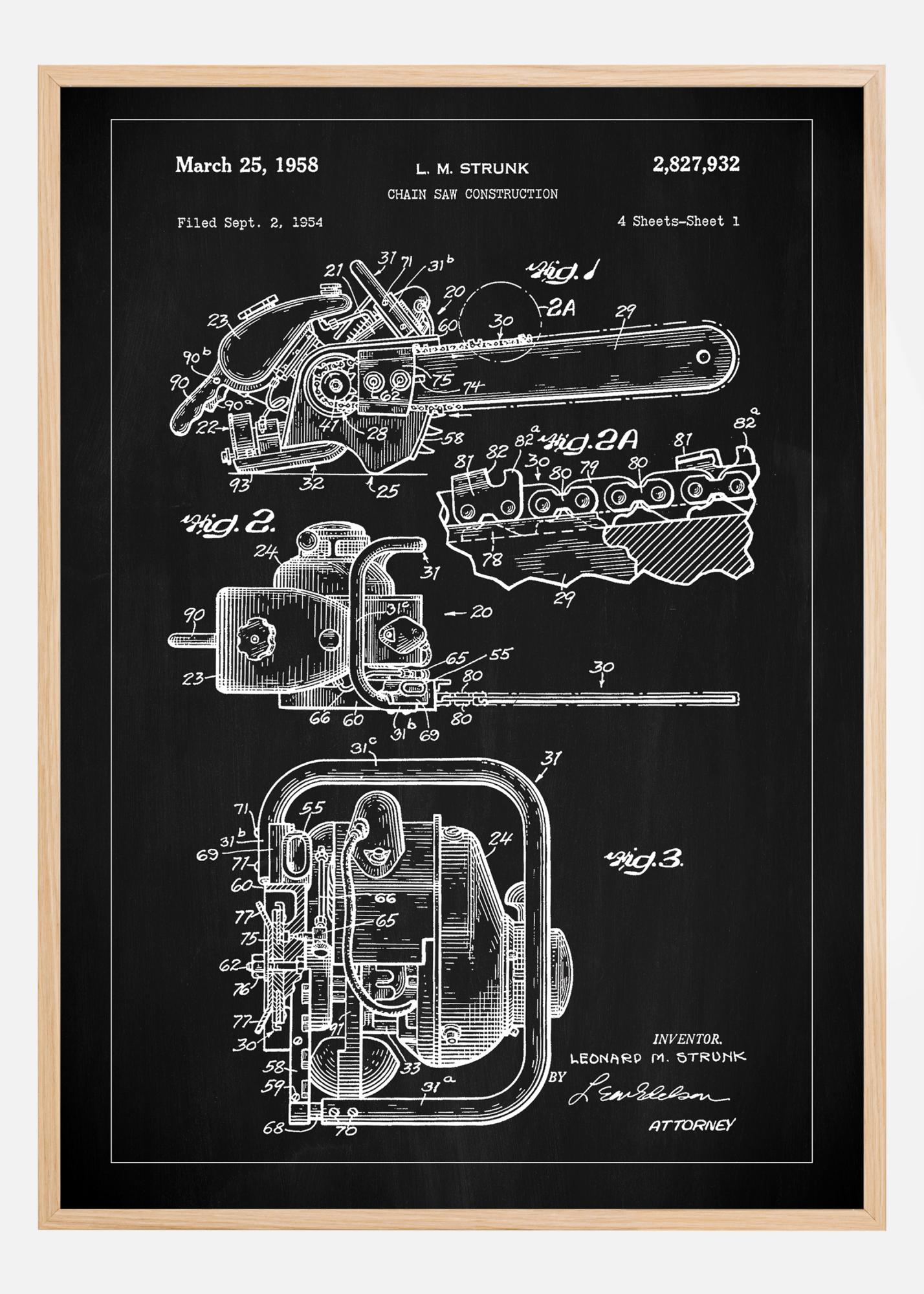 Ovaj patentni poster snažan je podsjetnik na zlatno doba inovacija, prikazan kroz dizajn Leonard M. Strunka za konstrukciju motorne pile, patentiran 25. ožujka 1958., s patentnim brojem 2,827,932. Ilustracija prikazuje detalje konstrukcije u oštrom kontrastu, pružajući vizualno razumijevanje mehanike koja pokreće ovaj esencijalni alat.