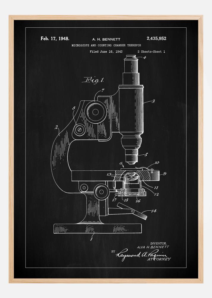 Ovaj patentni poster prikazuje sofisticiranu crnu ploču u pozadini koja elegantno naglašava klasični patentni crtež mikroskopa od 17. veljače 1948. Bijele linije protiv tamne pozadine pružaju dramatični efekt i ilustriraju konstrukciju mikroskopa i inovativne karakteristike njegove komore za brojanje. Ovo je ikoničan prikaz znanstvene preciznosti i ljepote u funkcionalnom dizajnu.