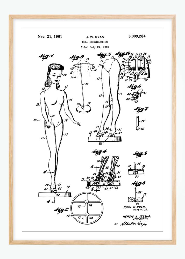 Ovaj osebujni patentni poster otkriva konstrukciju Barbie lutke, kojem je patent odobren 21. studenog 1961. pod brojem 3,009,284. Izumio ga je J.W. Ryan, a zahtjev je podnesen 24. srpnja 1959., crtež prikazuje jedinstvene dijelove i spojeve lutke, fascinantan primjer dizajna igračaka i inovacija sredinom 20. stoljeća. Poster je vrhunski komad za razgovor koji je savršen za kolekcionare ili kao razigran detalj u kreativnom prostoru.
