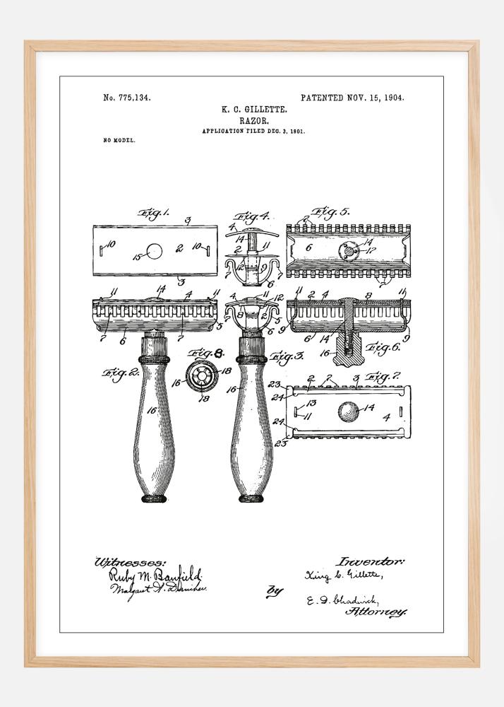 S ikoničnim i elegantnim dizajnom, ovaj patentni poster predstavlja revolucionarno stvaranje K.G. Gillette: britvicu, patentiranu 15. studenog 1904., broj patenta 775,134. Detalji ove patentne skice ističu mehaničke aspekte i inovativnu konstrukciju koja je zauvijek promijenila osobnu higijenu, a to je prvi put dokumentirano u prosincu 1901.