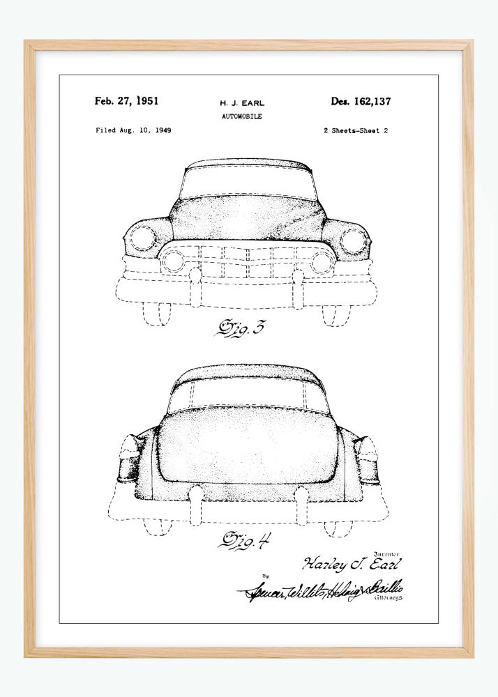 Ovaj elegantni patentni poster prikazuje kultni Cadillac, počast inženjerskim napretcima 20. stoljeća u području automobila. Dizajnirao ga je H.J. Earl, a patentiran je 27. veljače 1951. pod brojem Des. 162,137, ova patentna nacrt je neophodna za sve koji cijene estetiku klasičnih automobila i povijest dizajna. Poster prikazuje vozilo u profilu s prednje i stražnje strane, a detaljnost ilustracija izaziva osjećaj nostalgije i divljenja.