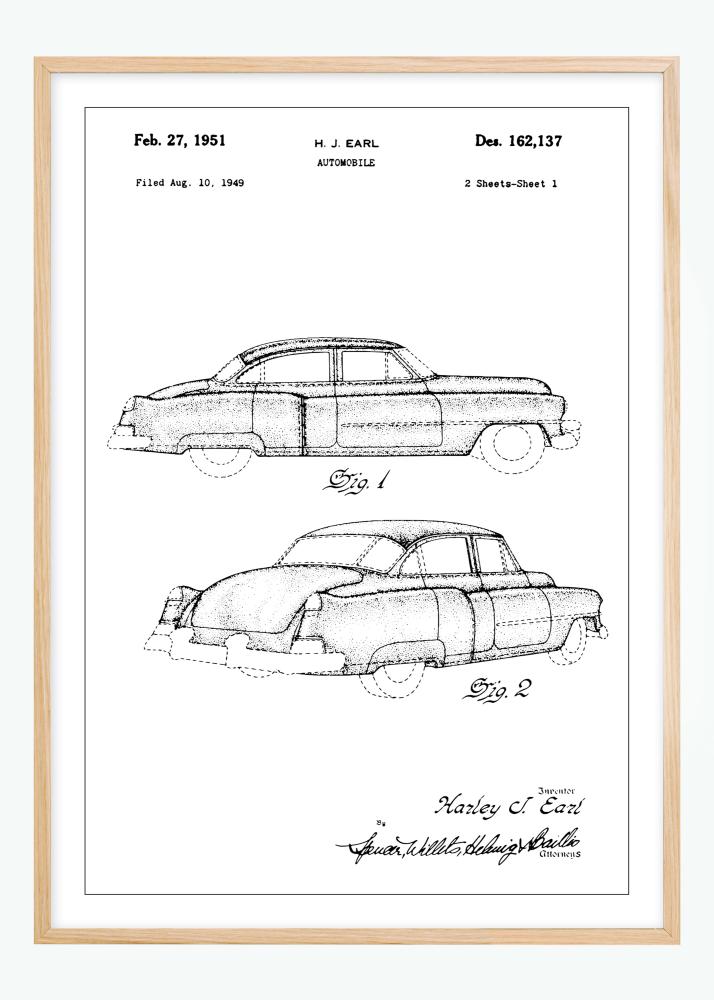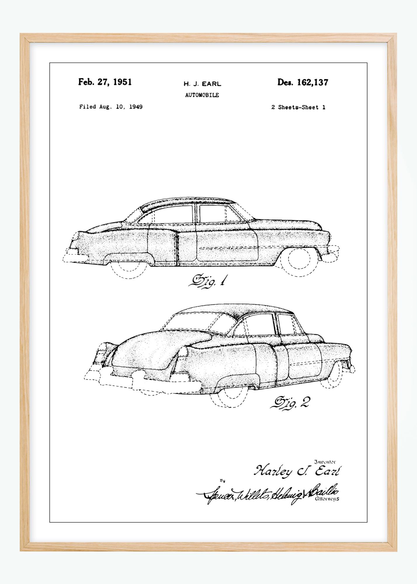 Ovaj patentirani poster prikazuje sofisticirani crtež automobila Cadillac, dizajniran od strane poznatog H.J. Earl-a. Datiran 27. veljače 1951. godine, s patentnim brojem Des. 162,137, koji je prvotno podnesen 10. kolovoza 1949., ova slika hvata bit automobilske industrije nakon Drugog svjetskog rata. Motiv je počast zlatnom dobu američkih automobila, izrađen s pažnjom na detalje koja privlači kako proizvođače automobila, tako i ljubitelje dizajna.