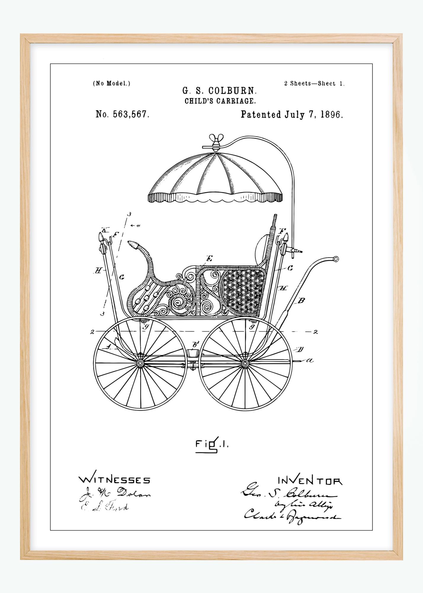 Ovaj šarmantni patentni poster prikazuje dječja kolica iz kasnog 19. stoljeća, patentni broj 563,567, odobren 7. srpnja 1896. za G.S. Colburna. Detalji u crtežu hvataju umjetnost i domišljatost vremena, što ovaj poster čini izvrsnim ukrasnim predmetom za sve koji cijene povijesni zanat i dizajn. Ilustracija prikazuje nostalgična dječja kolica, s šiljatim kotačima i elegantnom nadstrešnicom, odražavajući eleganciju i stil prošlog doba.