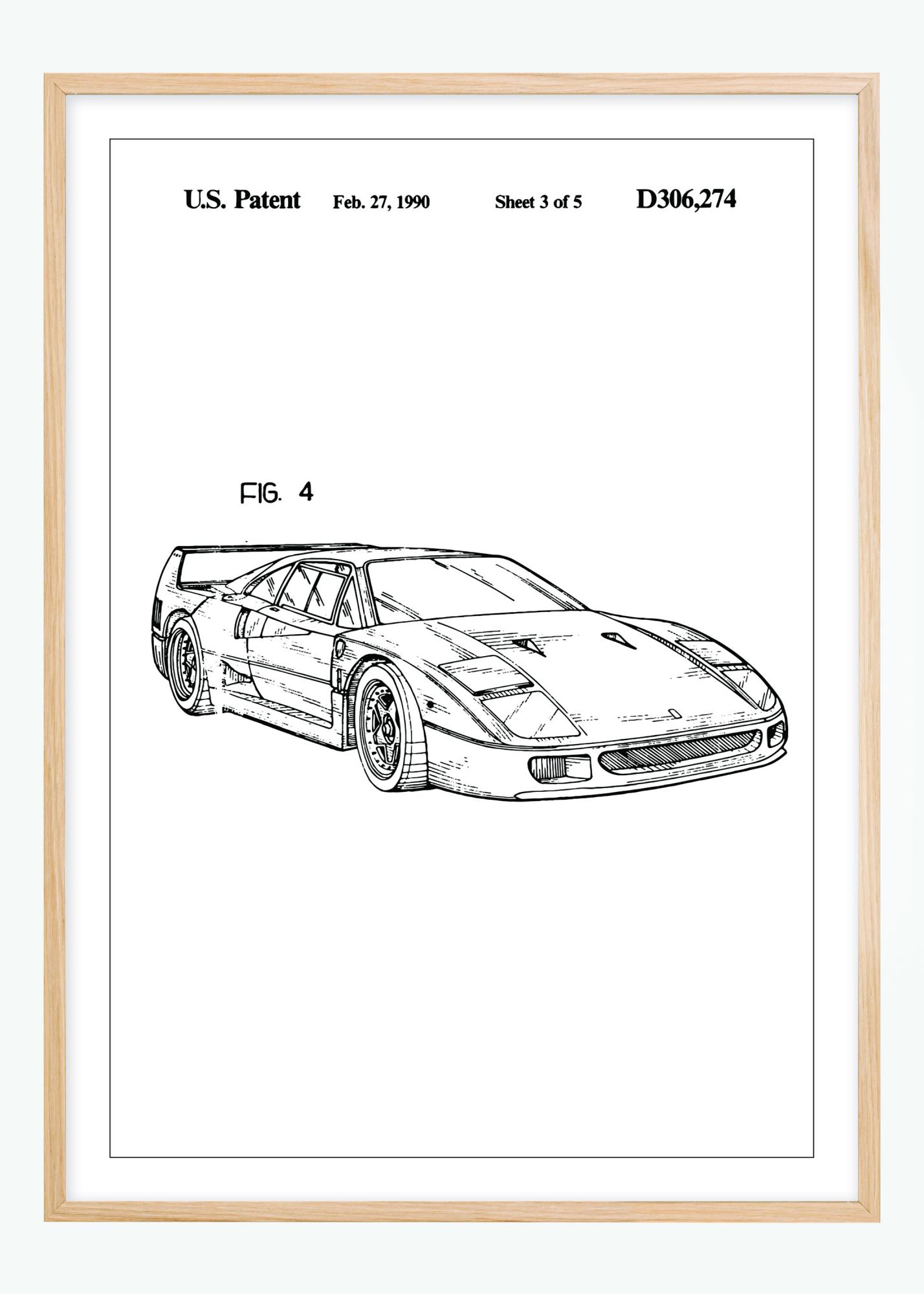Ovaj patentni poster prikazuje revolucionarni dizajn Ferrarija F40, detaljno izrađen 27. veljače 1990. godine, pod brojem patenta D306,274. Ilustracija prikazuje stranu jednog od najikoničnijih sportskih automobila u povijesti, poznatog po svojoj aerodinamici i prepoznatljivom stilu. To je slika inovacije i napretka u automobilskoj industriji, koja hvata pogled promatrača svojim oštrim linijama i dinamičnim oblikom.