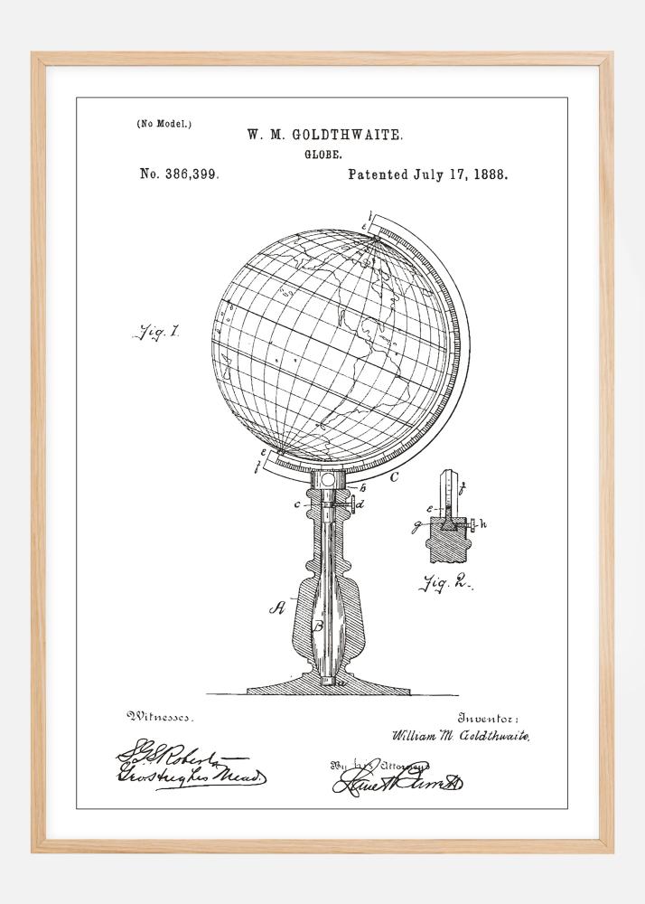 Ovaj patentni poster predstavlja pažljivo dizajnirani globus W. M. Goldthwaitea, koji je ovjekovječen s patentnim brojem 386,399, izdan 17. srpnja 1888. Poster ističe bezvremensku eleganciju i pedagošku vrijednost ovog klasičnog izuma, te ilustrira ljudsku težnju za kartografiranjem i razumijevanjem našega svijeta. Detaljnost u ovom patentnom crtežu prikaz je preciznosti i umjetničkog zanata, te stvara tematski razgovor u bilo kojoj prostoriji.