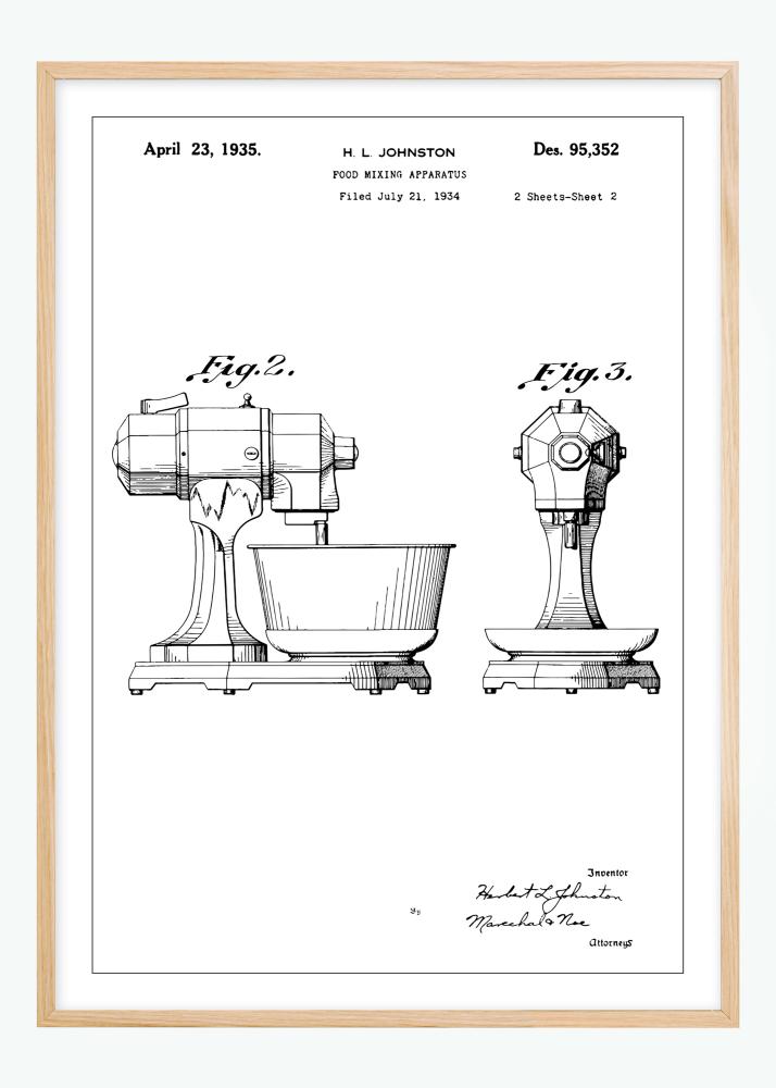 Ovaj pažljivo detaljiran patentni poster prikazuje uređaj za miješanje hrane, nužan alat u kuhinji koji je revolucionirao kulinarsku umjetnost. Patent, dizajniran od strane H.L. Johnstona 23. travnja 1935. pod brojem Des. 95,352, ilustrira rani dizajn stolnog miksera, kućanskog uređaja koji je postao neizostavan u modernom kuhanju. Figura prikazuje uređaj u dva prikaza, pružajući sveobuhvatno razumijevanje njegove konstrukcije i funkcije.
