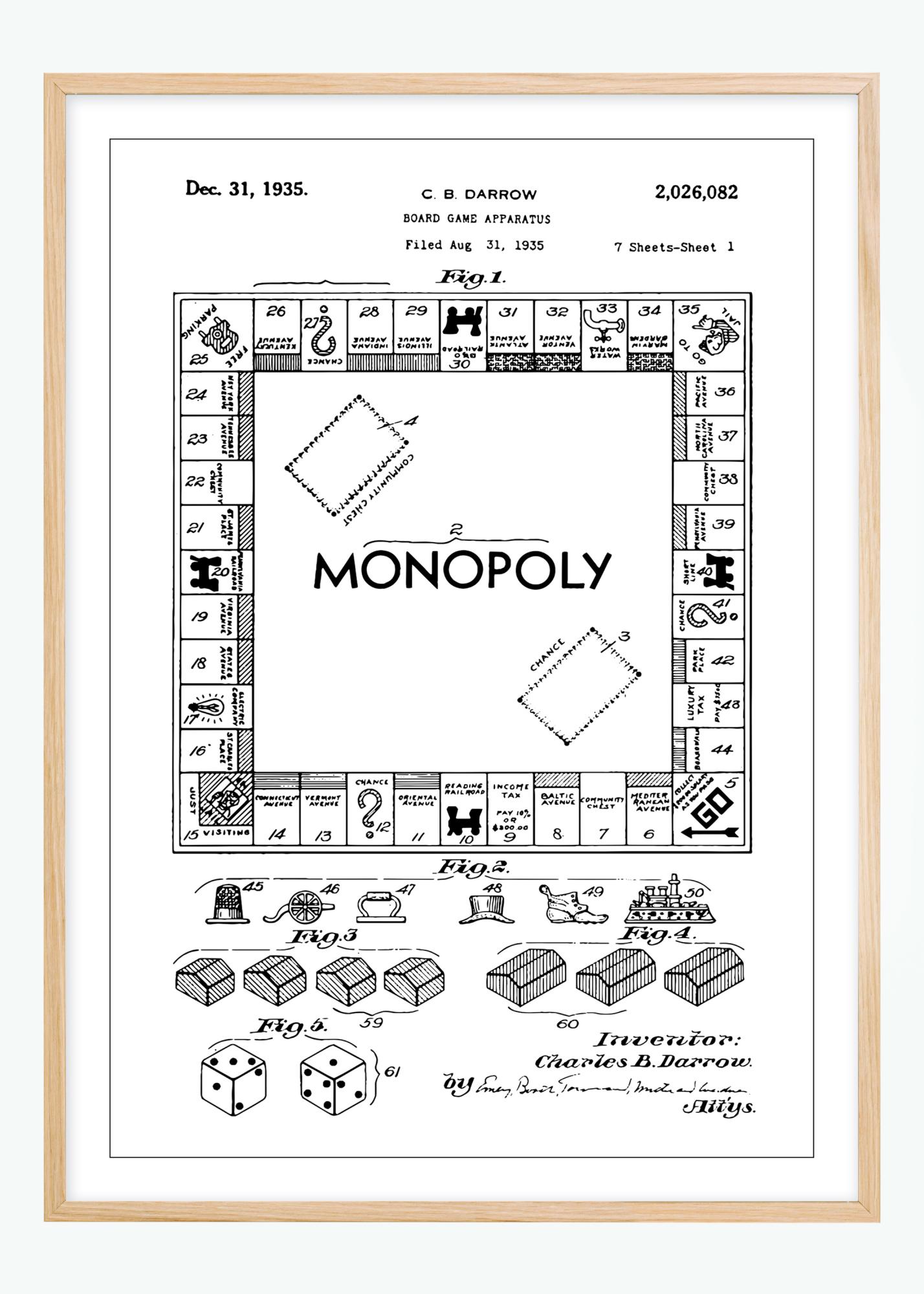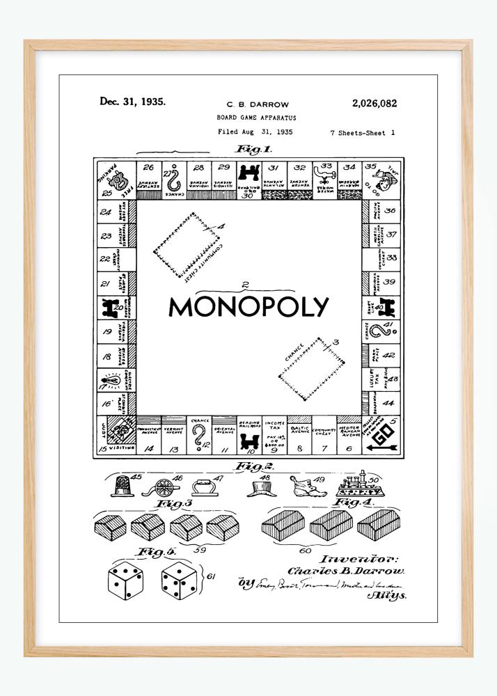 Ovaj patentni poster prikazuje klasični dizajn voljene društvene igre Monopoly, kulturnu ikonu obiteljske zabave i igara. Datumi pokazuju da je izumitelj Charles B. Darrow podnio zahtjev za patent 31. kolovoza 1935., a odobren je 31. prosinca iste godine s brojem 2,026,082. Detaljni crtež prikazuje pregled ploče igre, zajedno s poznatim poljima "kreni", "šansa" i vlasništva, kao i ikonične figurice i kockice, što donosi nostalgični osjećaj i poštovanje za ovu bezvremensku igru.