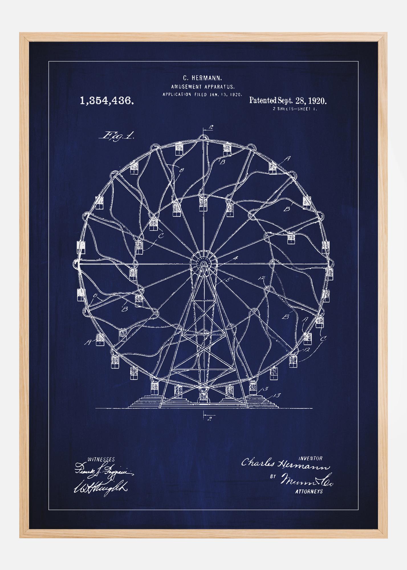 Pretvorite bilo koji zid u počast klasičnog inženjerstva s ovom patentskom posterom dizajna C. Hermanna za zabavnu atrakciju, specificiranog u patentnom broju 1,354,436 koji je odobren 28. rujna 1920. Ova vješto kreirana ilustracija panoramskog kotača nije samo dekorativno umjetničko djelo, već i prikaz vremena kada su zabave postale tehnička dostignuća. Detalji konstrukcije hvataju prošlo doba zlatnog razdoblja zabavnih parkova i remek-djela mehaničke umjetnosti.