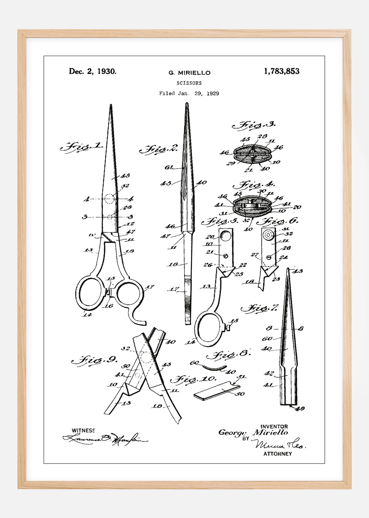 Elegantna i poučna, ova patentna poster prikazuje inovativni dizajn škara G. Mirella, patentiran 2. prosinca 1930. pod brojem 1,783,853. To je edukativni uvid u razvoj alatke iz ranog 20. stoljeća, od precizno naoštrenih oštrica do fino izrađenih ručki. Svaki detalj na patentnom crtežu prikazan je s preciznošću, pokazujući tehničko znanje i dizajnersku sposobnost koja je obilježila izume tog doba.
