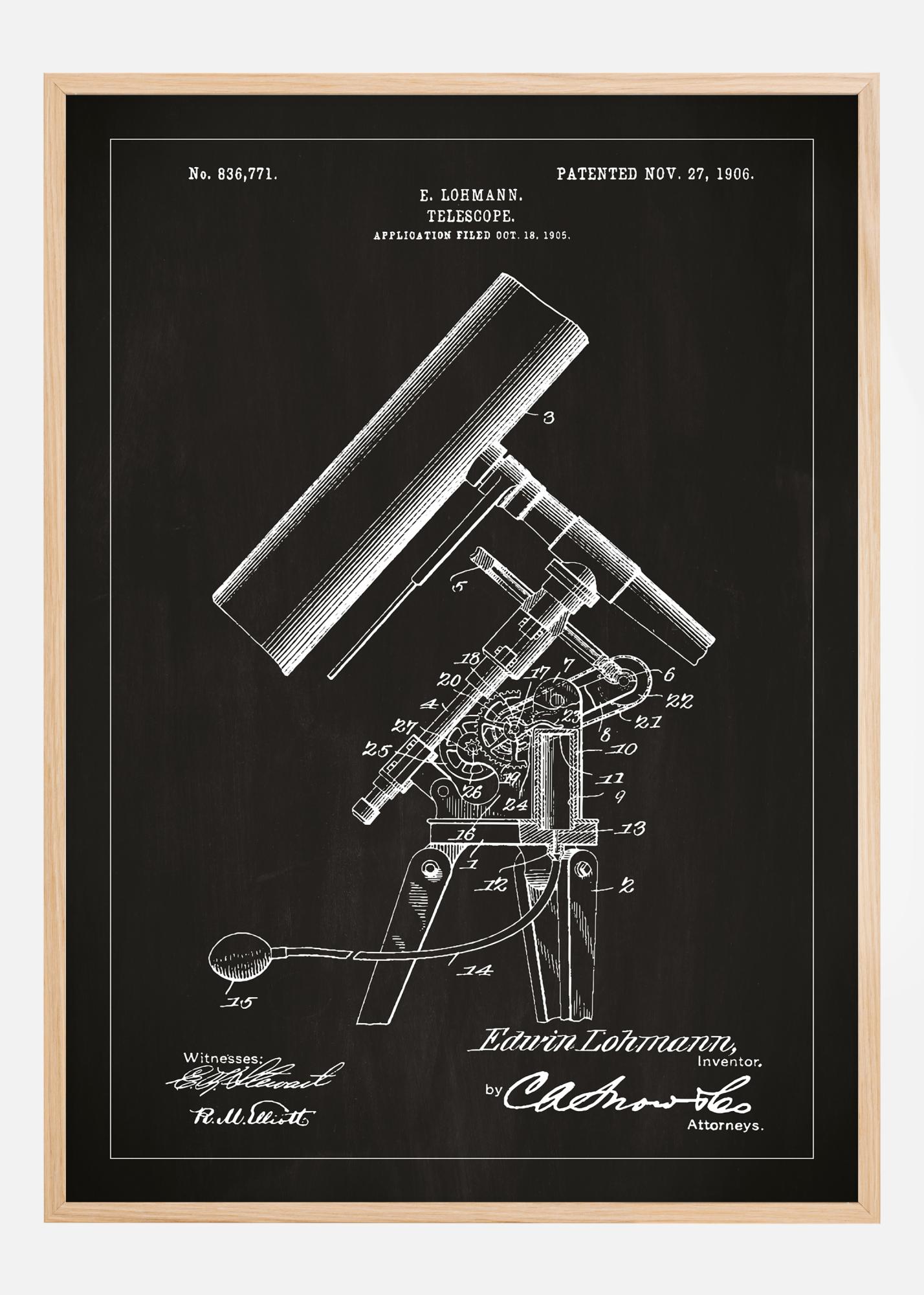 Ovaj detaljan patentni poster prikazuje teleskop E. Lohmanna, patentirano 27. studenog 1906. godine s patentnim brojem 836,771. Ilustracija precizno hvata složenu mehaniku i finomehaničke detalje teleskopa. Poster's odvažan kontrast između intrikatnih linija i tamne pozadine čini ga upečatljivim detaljem interijera, koji istovremeno odaje počast bogatoj povijesti astronomije i optike. To je fascinantna počast znanstvenom napretku s početka 20. stoljeća i inspirativna točka za sve entuzijaste znanosti.