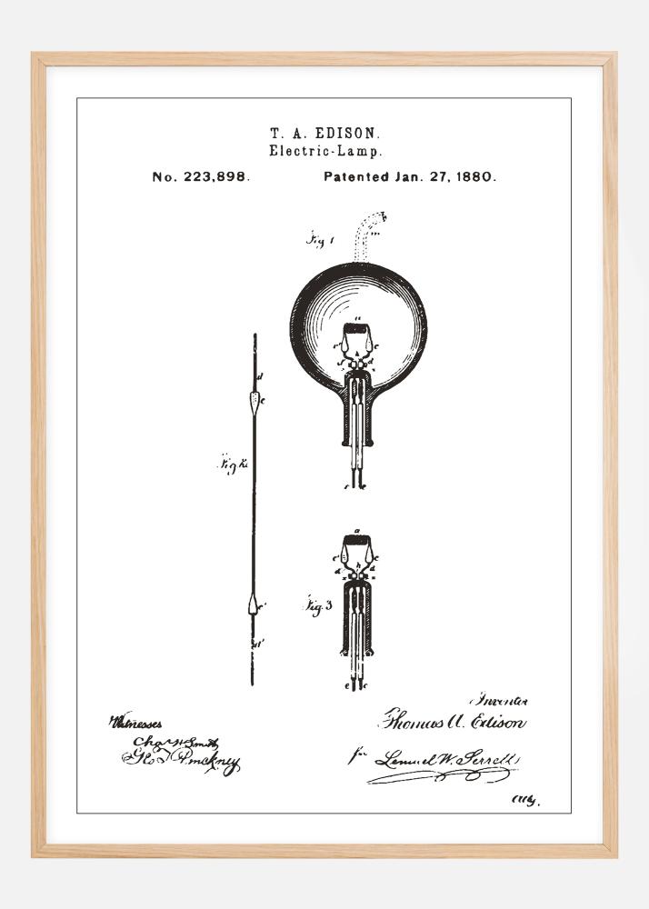 Ovaj bezvremenski patentni poster prikazuje revolucionarnu elektriÄnu lampu Thomasa A. Edisona, koja je osvijetlila naÅ¡e živote otkad je dobila patentni broj 223,898, 27. sijeÄnja 1880. Ovaj elegantni i edukativni plakat je poÄast jednom od najveÄih izuma svih vremena i pruža jedinstven uvid u tehnoloÅ¡ke inovacije. Detalji crteža otkrivaju precizan proces iza izuma žarulje, proizvoda koji je srediÅ¡nji u naÅ¡im svakodnevnim životima. Ovaj poster je sjajan pokretaÄ razgovora i izvor inspiracije, savrÅ¡en za sve koji cijene povijesnu tehnologiju i dizajn.