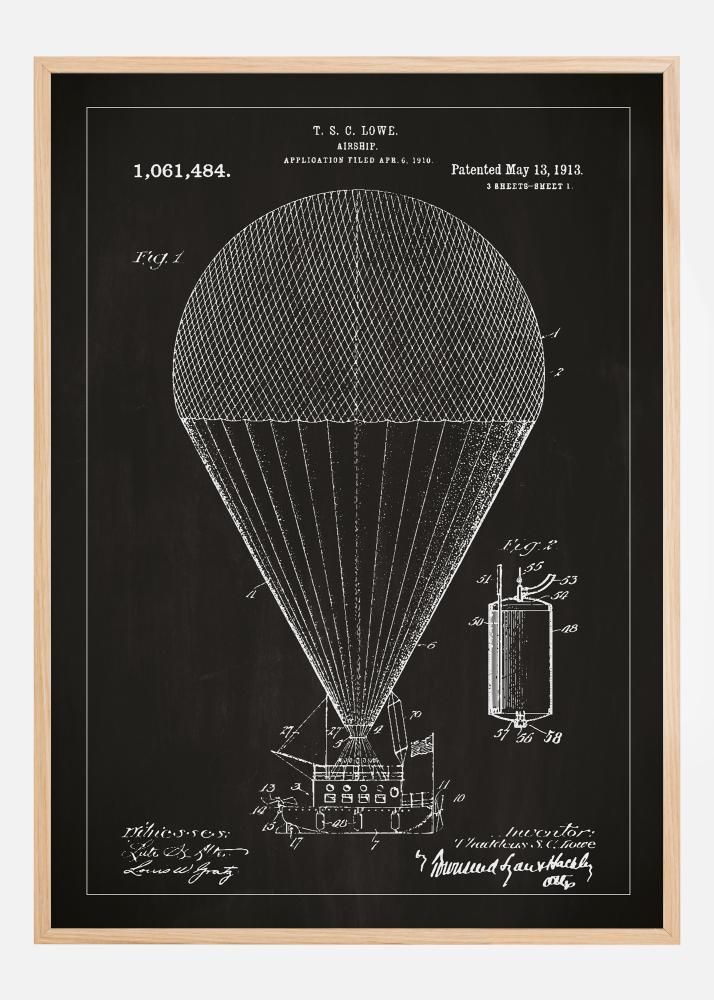Ovaj patentni poster vraća nas u prve dane magije i avanture zrakoplovstva. S patentom datiranim 13. svibnja 1913., s brojem 1,061,484, ova precizna reprodukcija dizajna zračnog broda T. S. Lowea prikazuje značajnu tehnološku prekretnicu u ljudskoj inovaciji. To je izvrsna umjetnička reprezentacija ranih pokušaja osvajanja neba.