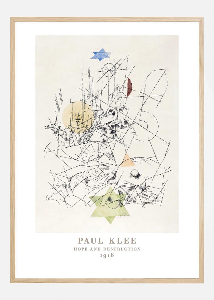 Ovaj umjetnički poster prikazuje djelo Paula Kleea, naslovljeno "Nada i Razaranje" iz 1916. godine, i hvata jedinstvenu kombinaciju apstraktne umjetnosti i simbolike koja je karakteristična za Kleeov stil. Motiv je bogat linijama i oblicima koji međusobno djeluju preko površine kompozicije, dajući osjećaj i reda i kaosa. Ovo je print koji bi mogao privući one koji cijene i modernu i suvremenu umjetnost, idealan za dodavanje poticajne dimenzije svakom prostoru ili uredu.