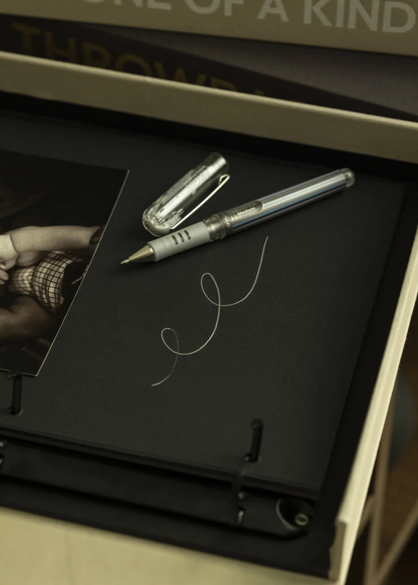 Olovka od Pentel s metalik srebrnom bojom. Olovka ima širinu vrha od 1 mm.