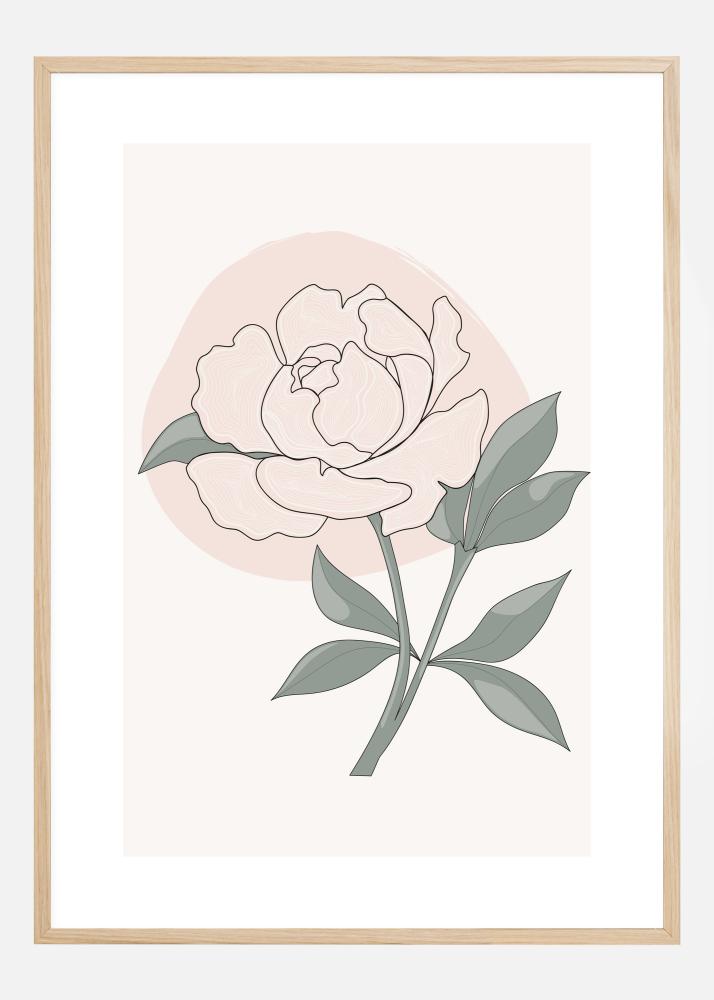 Umjetnički poster s granom božura i ružičastim cvijetom. Na bež pozadini ružičasti cvijet je postavljen na figuru boje breskve, dok su listovi skicirani u crnoj boji. Unesite krhkost ovog cvijeta u svoj dom.