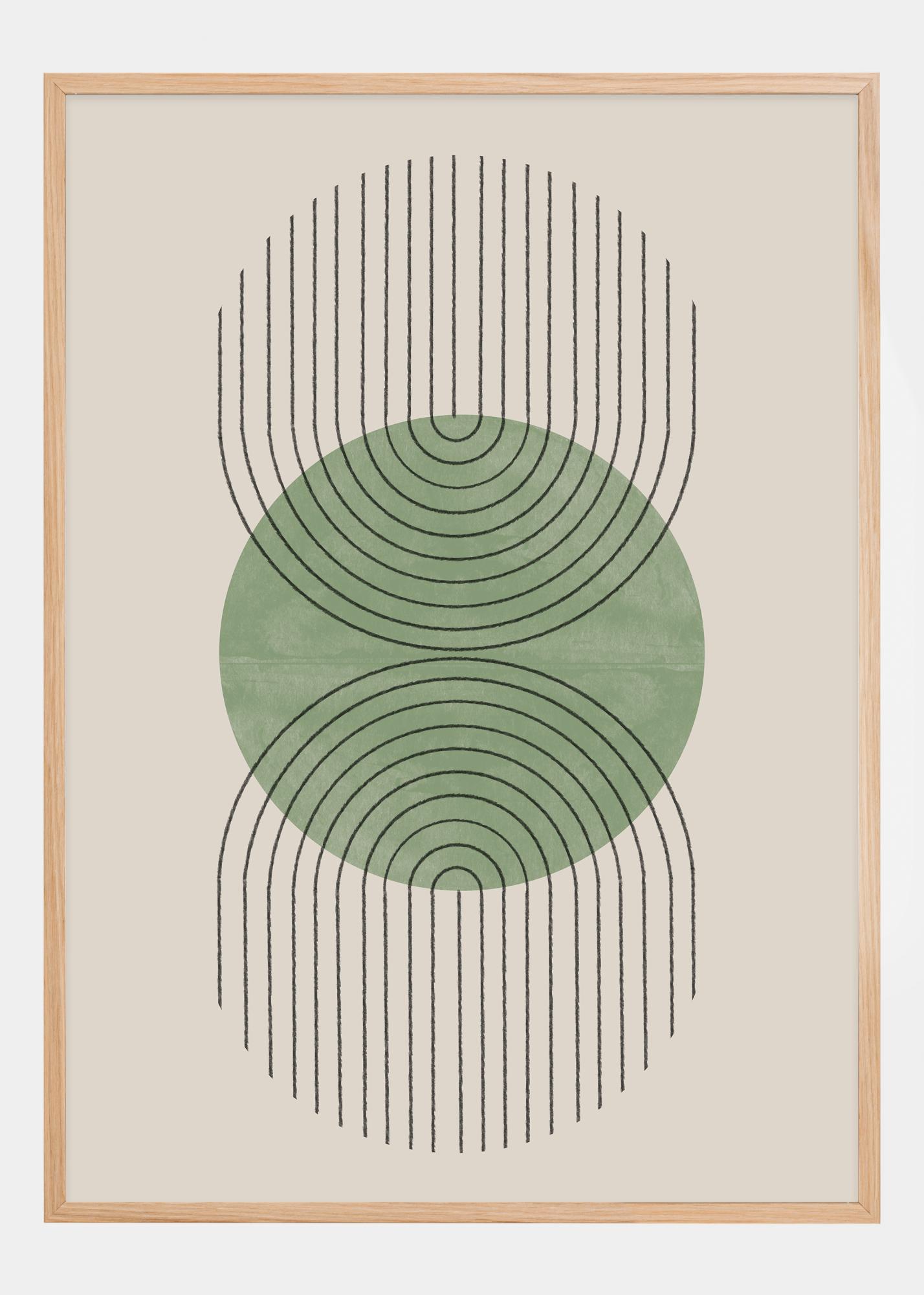 Ovaj poster je minimalističko umjetničko djelo koje naglašava zasićeni zeleni kružni oblik okružen nizom crnih linija, što daje osjećaj prostora i dubine. Zeleni nijansa u krugu varira u intenzitetu, stvarajući vizualni efekt dimenzije i teksture. Linije, koje se protežu prema van od ruba kruga, stvaraju gotovo hipnotički efekt i predstavljaju geometrijsku harmoniju.