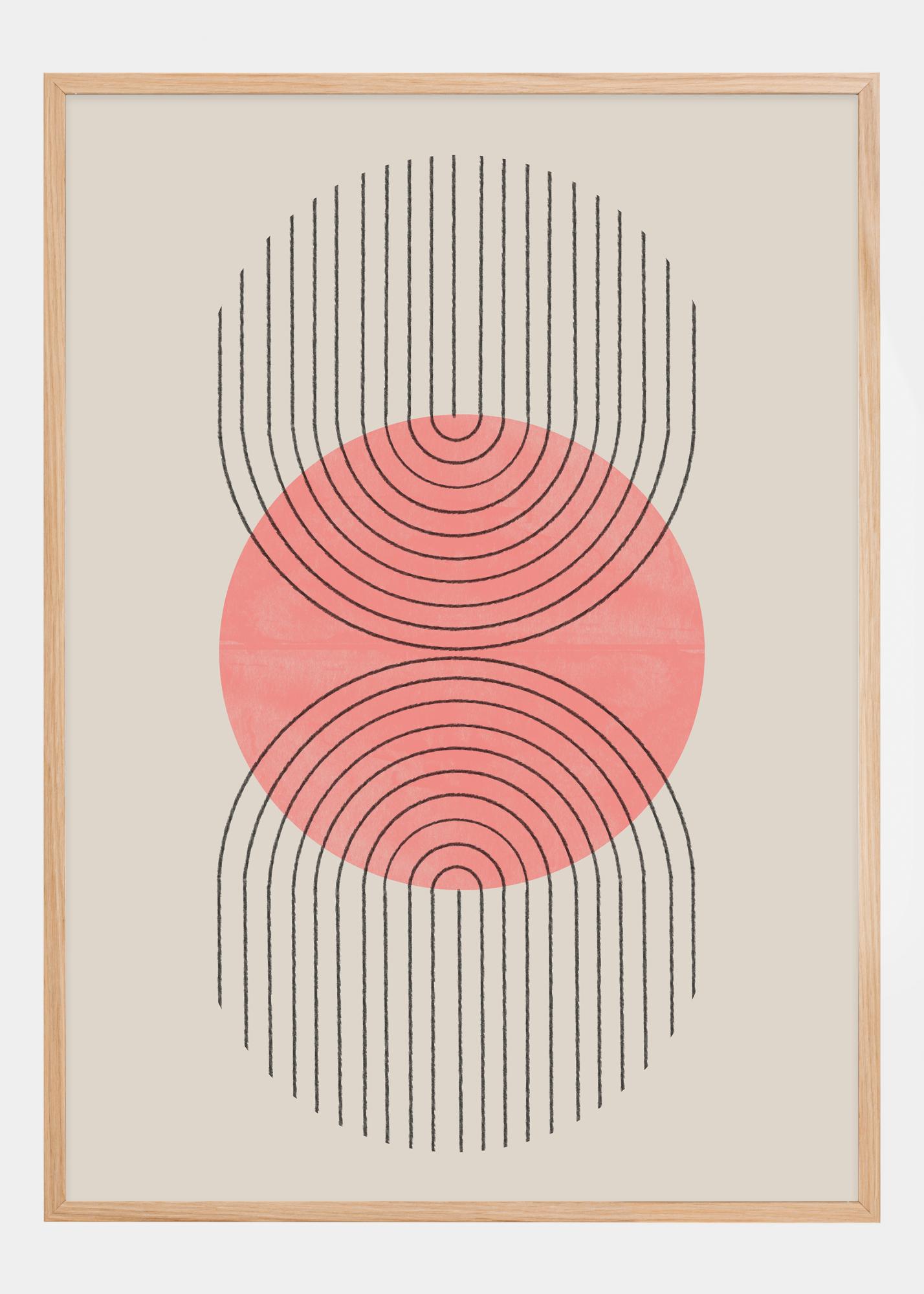 Ovaj suvremeni poster kombinira jednostavnost geometrijskog oblika s nježnom, privlačnom breskvaste bojom. Središnji krug s koncentričnim prstenovima, koji podsjeća na mirnu površinu vode, okružen je poljem vertikalnih crnih linija koje se čini kao da pulsiraju prema van. Ovaj kontrast između okruglog oblika i ravnih linija stvara zanimljivu dinamiku i dojam kretanja u umjetničkom djelu.