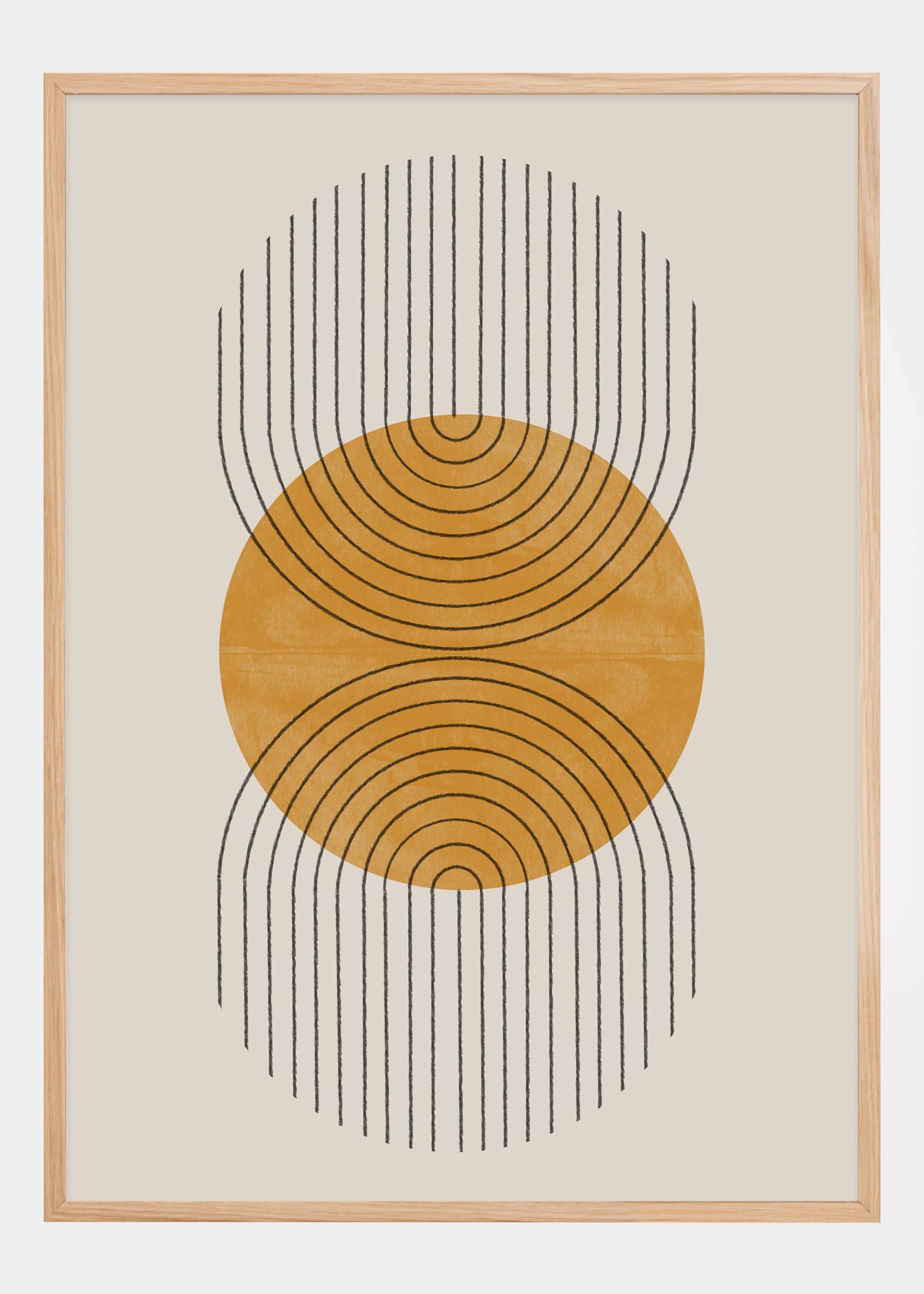 Ovaj umjetniÄki poster predstavlja snažnu vizualnu kompoziciju postavljanjem zasiÄenog, zlatno žutog kružnog oblika u srediÅ¡te okruženog vertikalnim crnim linijama koje stvaraju optiÄku iluziju Å¡irenja i skupljanja. KoncentriÄni krugovi unutar žutog oblika dodaju osjeÄaj dubine i daju organsku kvalitetu inaÄe strogo geometrijskom uzorku.