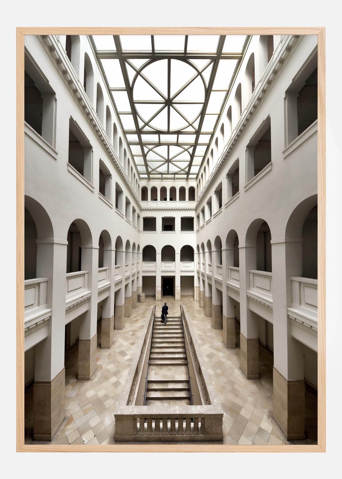 Veličanstveni poster s Peter Behrensovom zgradom. Bež i bijela unutrašnjost hvata figuru koja se penje stubama. Prozirni krov osvjetljava detalje arhitekture s okruglim i četvrtastim prozorima koji propuštaju svjetlo. Stvorite elegantnu atmosferu s ovim fantastičnim tiskom.