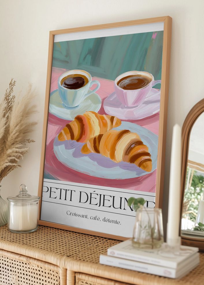 Ovaj šarmantni poster dočarava bit klasičnog francuskog doručka s dvije šalice vruće kave i zlatnim kroasanima koji ponosno stoje na pastelnom stolu. Savršen za kuhinju ili kafić, motiv odiše osjećajem opuštenosti i uživanja, što ga čini idealnim izborom za sve koji vole francusku estetiku.