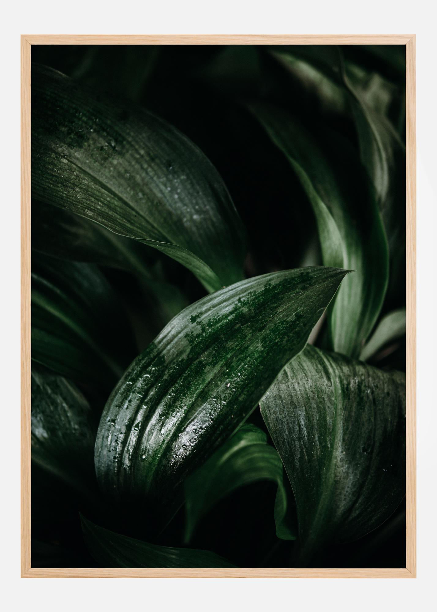 Prikaz izbliza mokrog lišća koje gusto prekriva poster. Kapljice vode na lišću stvaraju sjajnu atmosferu. Tamna, mutna pozadina prikazuje ostalo lišće koje se bori da se vidi. Ova savršena ljepota savršena je za vaš dom.