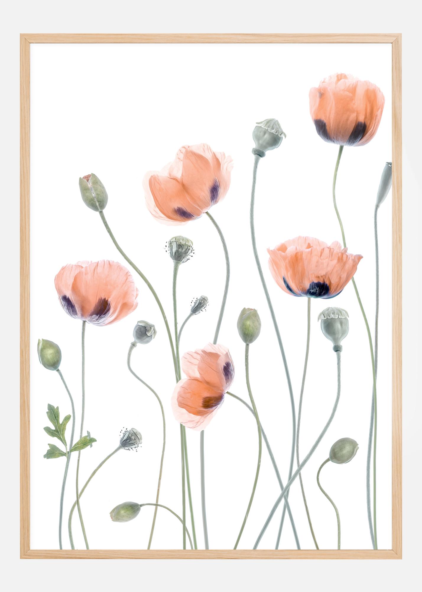 Očaravajući tisak makova isprepletenih sa sušenom travom. Na bijeloj pozadini, cvjetovi maka boje breskve savršeno se stapaju s svijetlozelenom travom. Svaki mak stoji na različitoj visini. Prekrasan i umirujući plakat za objesiti u seoskoj kuhinji.