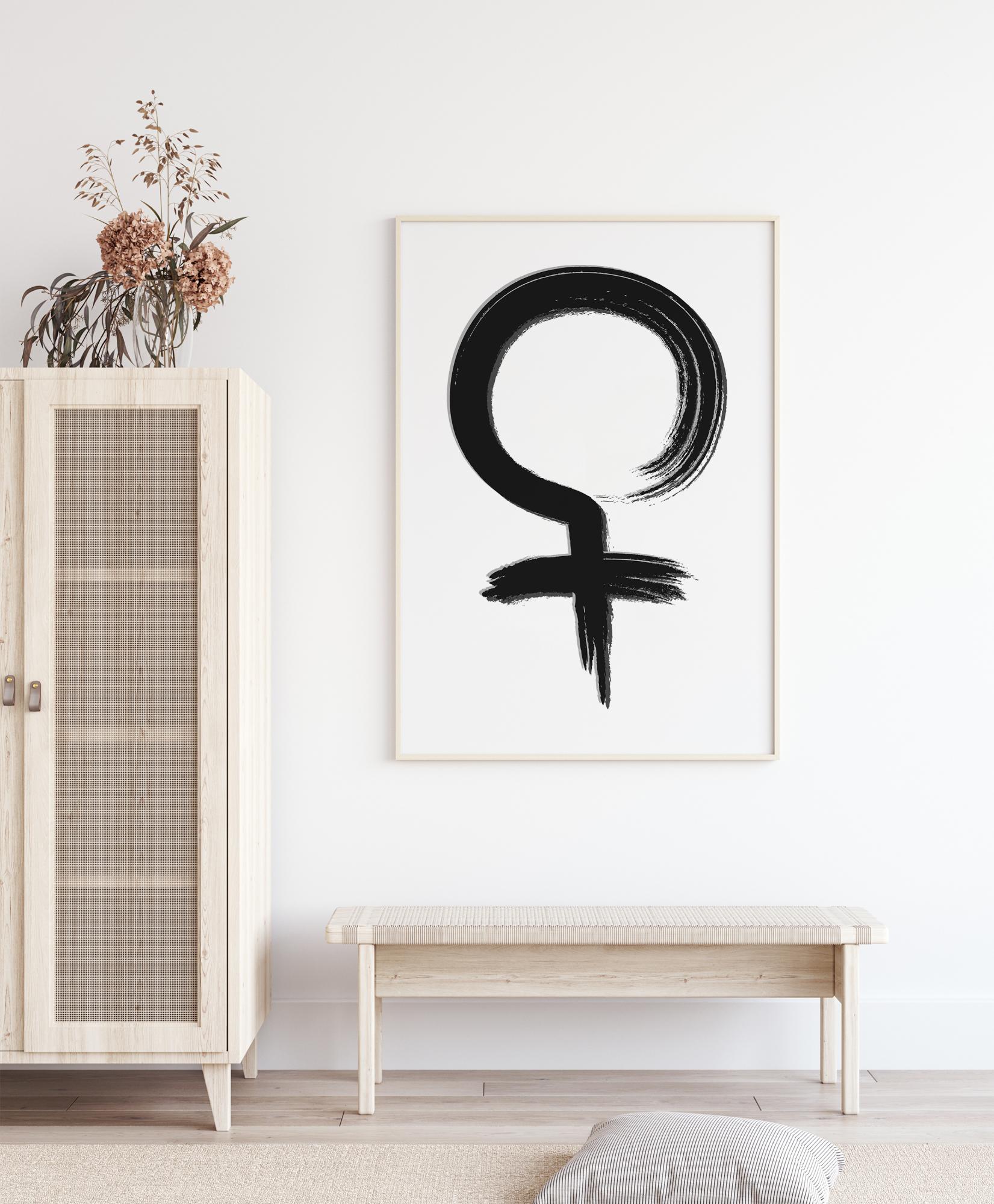 Jednostavan crno-bijeli print koji ilustrira znak za ženu s nepotpunim krugom. Na bijeloj pozadini crni simbol blijedi prema kraju prstena. Savršen poster za objesiti u ženskom okruženju.