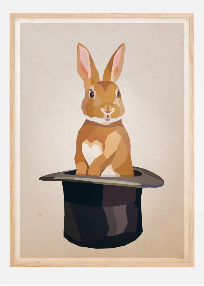 Jednostavan ali zabavan poster s zecom koji sjedi u šeširu mađioničara. Zec zlatne boje mirno sjedi i veselo gleda prema promatraču. Na bež pozadini boje zeca se savršeno uklapaju. Ova prekrasna slika pretvorit će dječju spavaću sobu u toplo i prijateljsko okruženje.