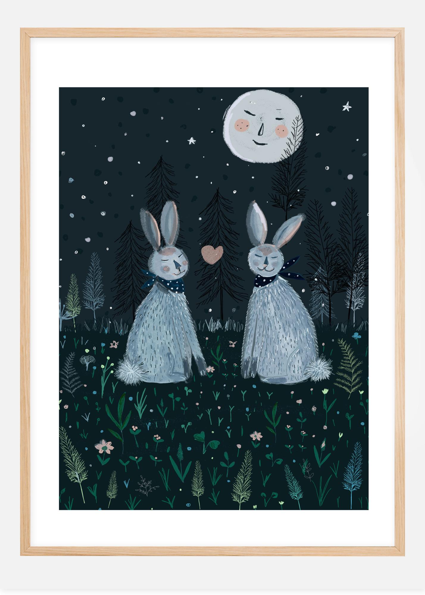 Zabavan poster s mjesecom i šumskim zečevima koji slatko spavaju. Zvijezde sjaje jasno dok zemaljske biljke okružuju ugodnu večernju atmosferu. S maramama zavezanima oko zečjih vratova i srcem smještenim između njih, ovo je savršen tisak za sve koji su zaljubljeni.