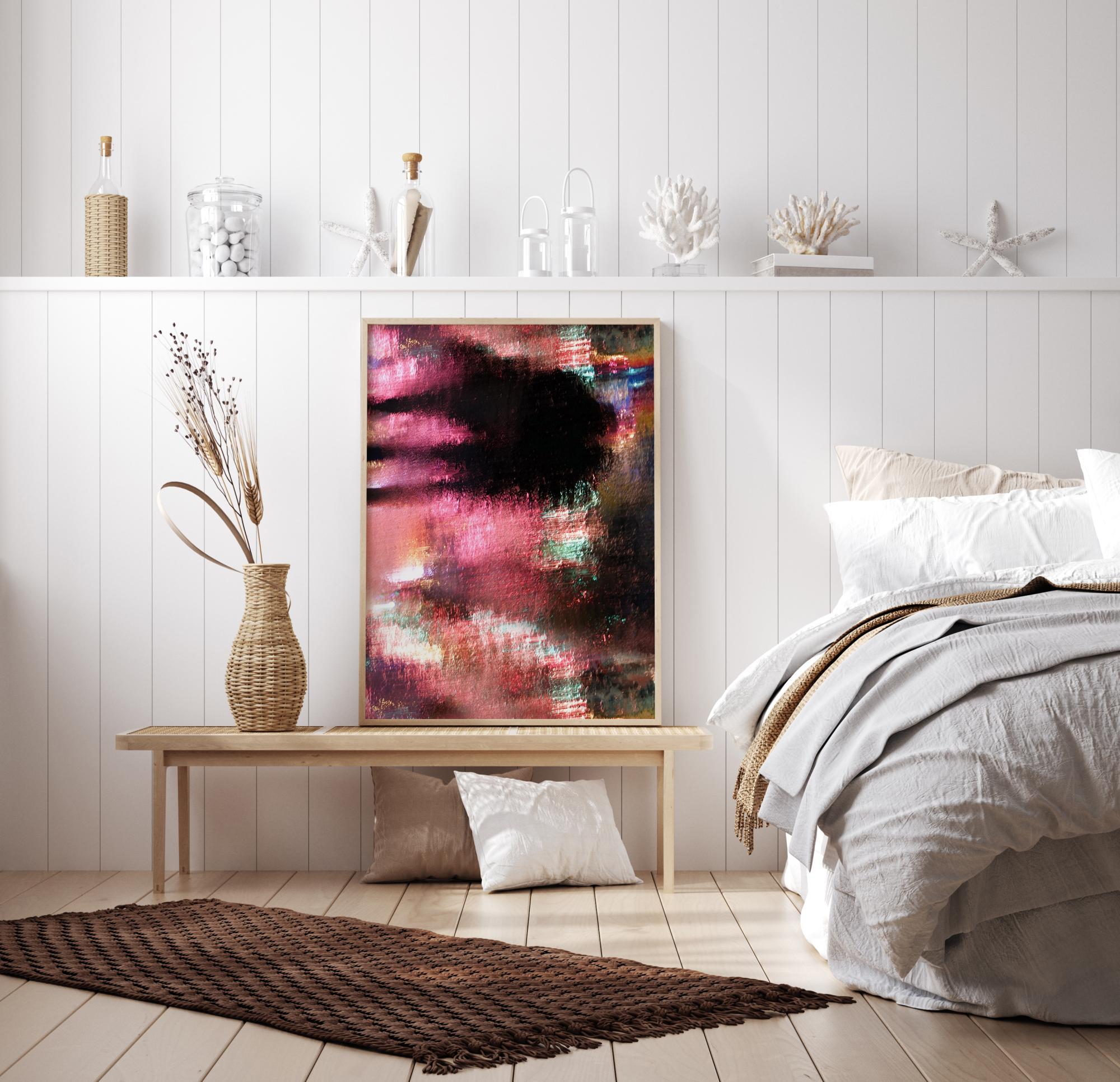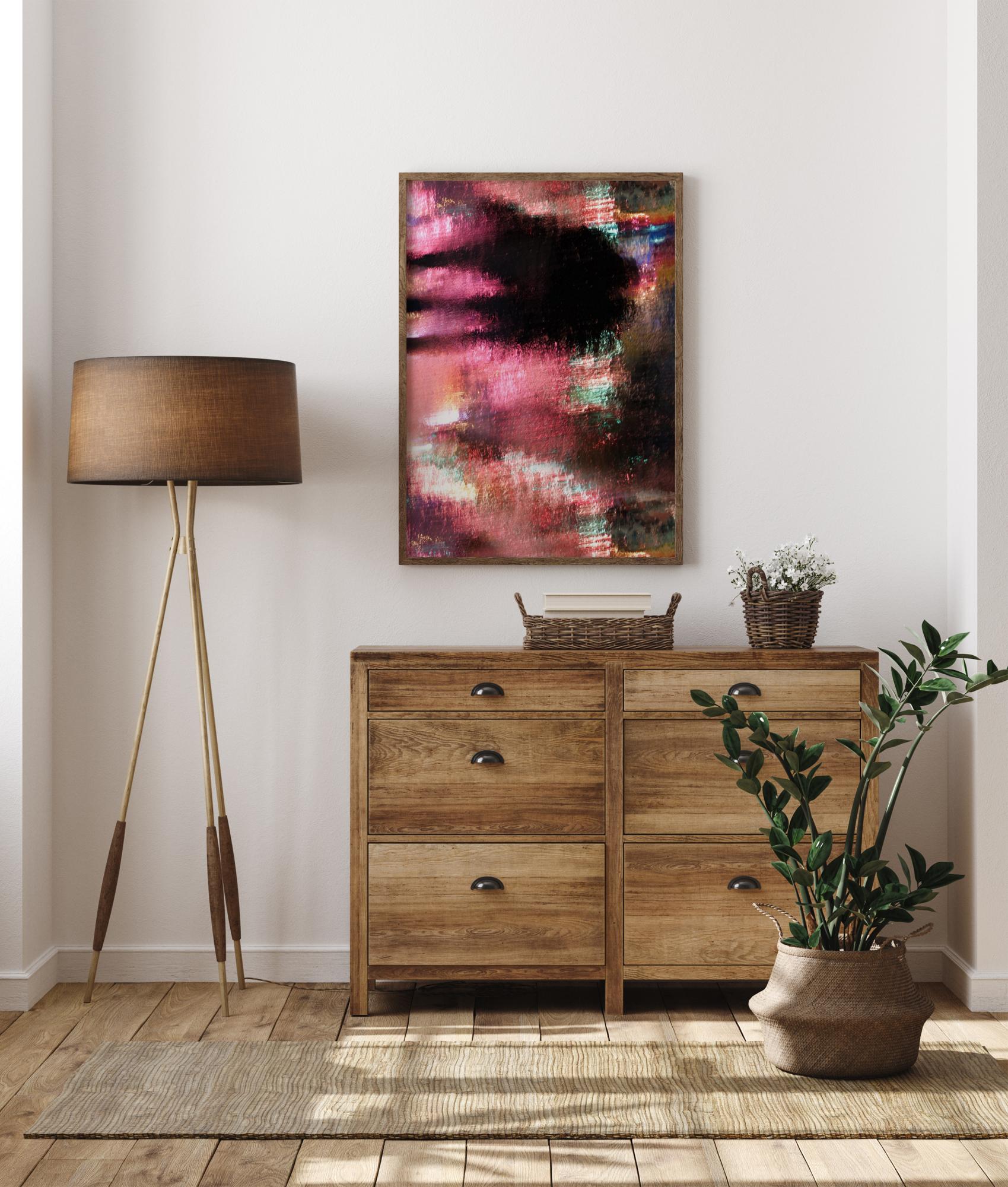 Savršena mješavina boja s ružičastim tonovima dominira ovim višebojnim tiskom. Na vrhu tiska nalazi se crno područje koje stvara osjećaj dubine. Desno od crnog područja nalazi se vertikalni cilindar u crvenoj i zelenoj boji. Savršen poster za dodavanje daška boje neutralnom zidu.