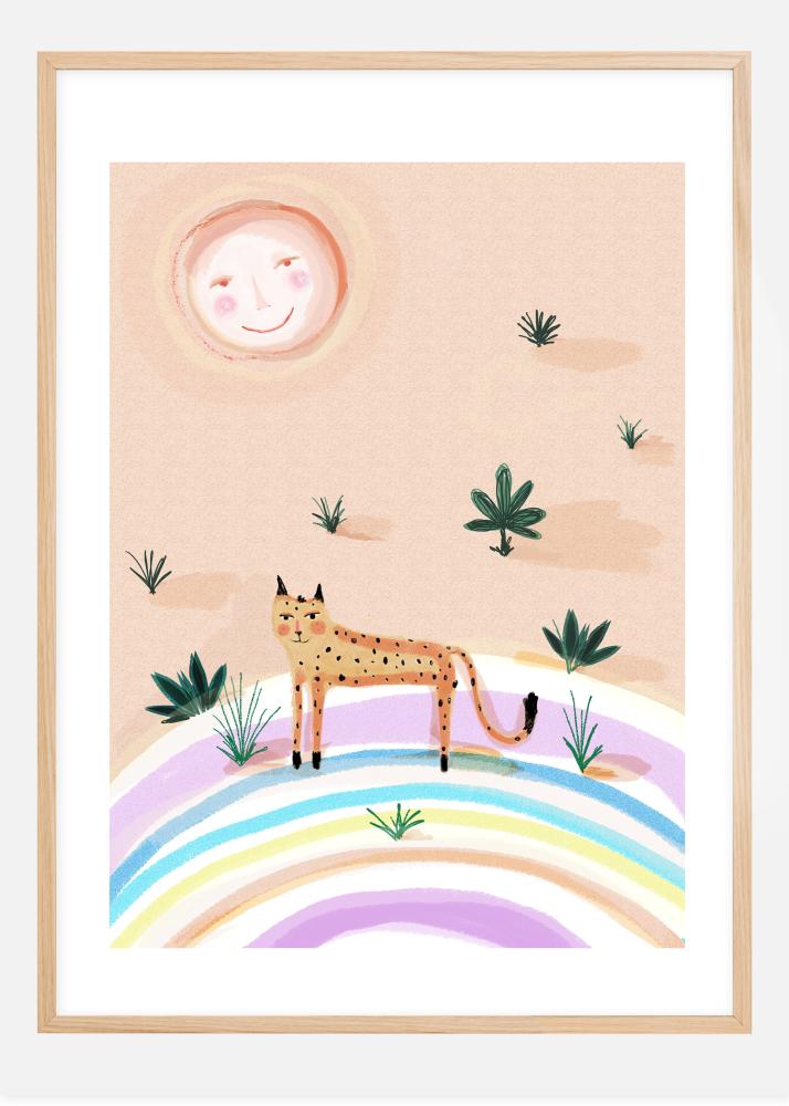 Smiješan posteri iz pustinje s leopardom i suncem koji se oboje smiju. Postavljen na šarenu podlogu, mali, tanki leopard okružen je malim pustinjskim biljkama. Idealni print za vješanje u dječjoj sobi kako bi se stvorila vesela atmosfera.