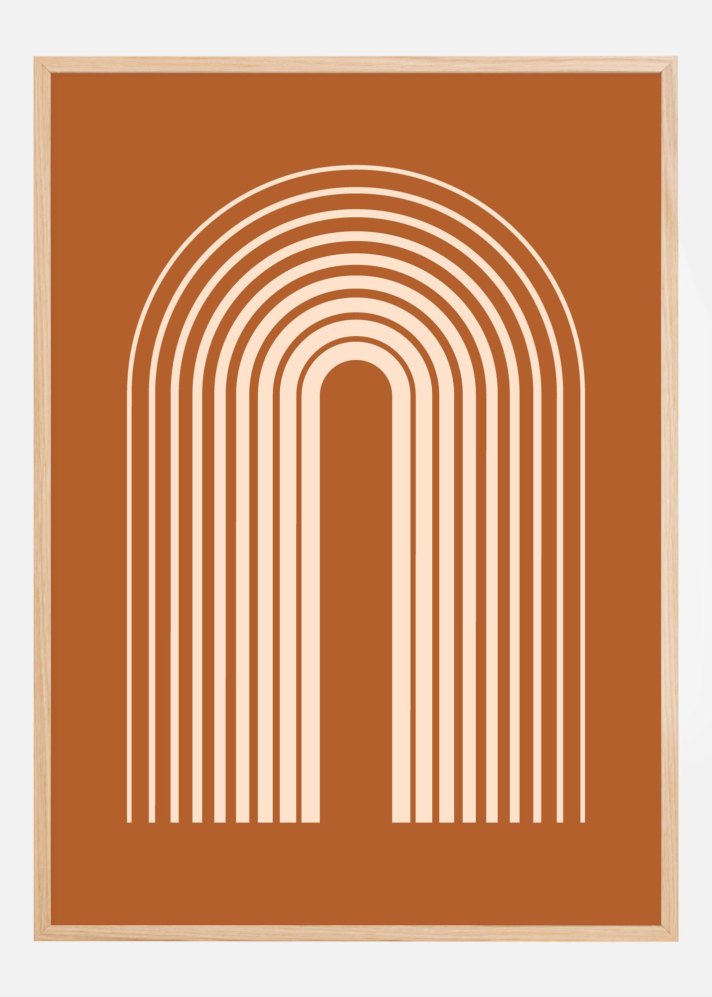 Ova poster s apstraktnim uzorkom poluluka odaje počast modernoj umjetnosti i dizajnu. Uzorak se pojavljuje kao niz savršeno simetričnih lukova u toplim, tonalnim bojama koje pružaju smirujući i ritmički vizualni dojam. Stabilna tamnija terakota pozadina nudi dubok i bogat pejzaž iz kojeg svjetlije linije dolaze do izražaja, stvarajući dinamičan kontrast koji plijeni pogled.