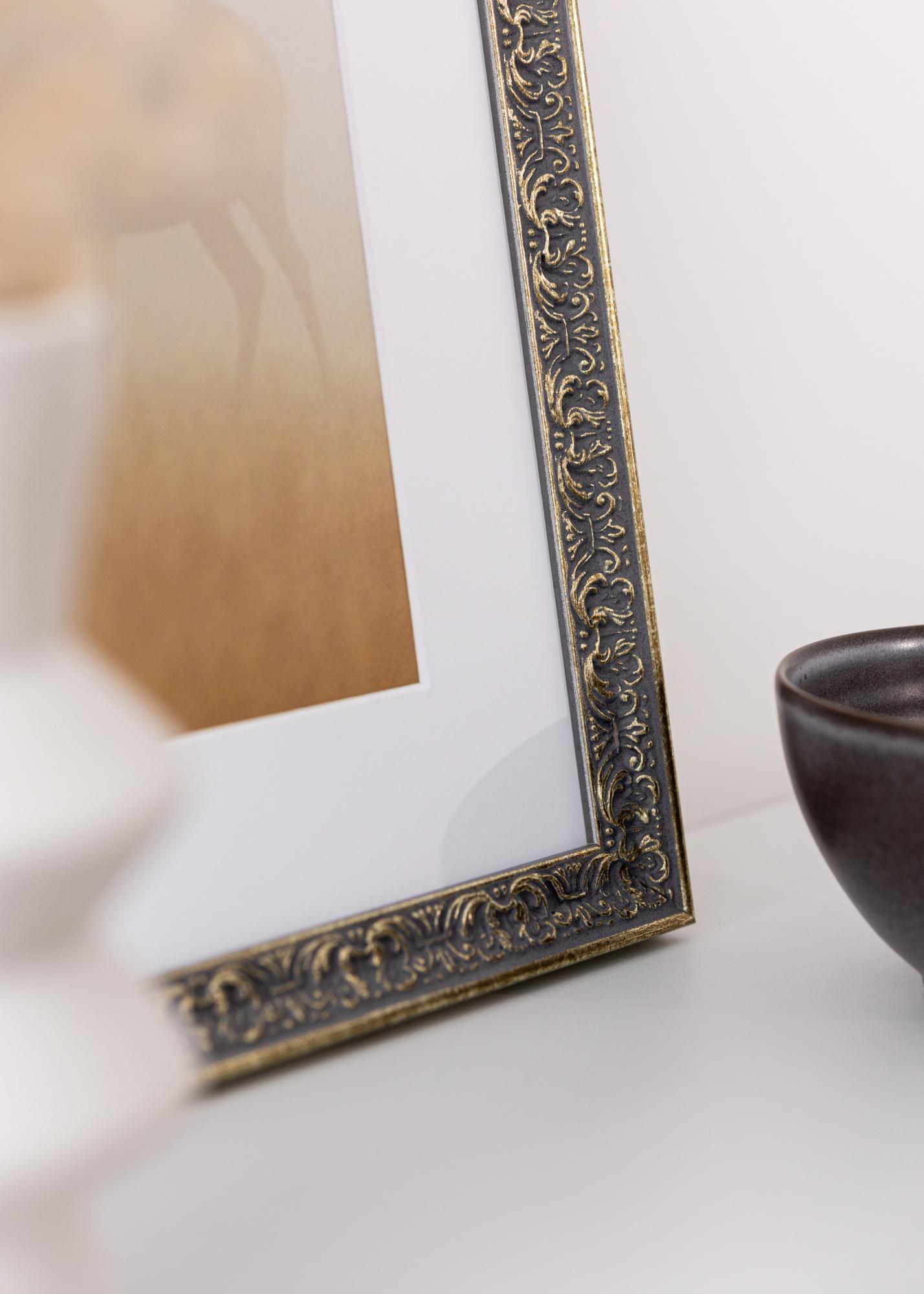 Ovaj elegantan srebrni okvir za slike savršena je kombinacija klasičnog dizajna i moderne funkcionalnosti. Sa svojim stilom inspiriranim antikom i prekrasno detaljno ukrašenim ornamentima u sivkasto nijansi sa zlatnim elementima, daje vintage osjećaj koji poboljšava bilo koju prostoriju. Okvir je izrađen od drva i ima 25 mm širok rub okvira i dubinu od 24 mm, što mu daje robusnost i čvrst osjećaj.
